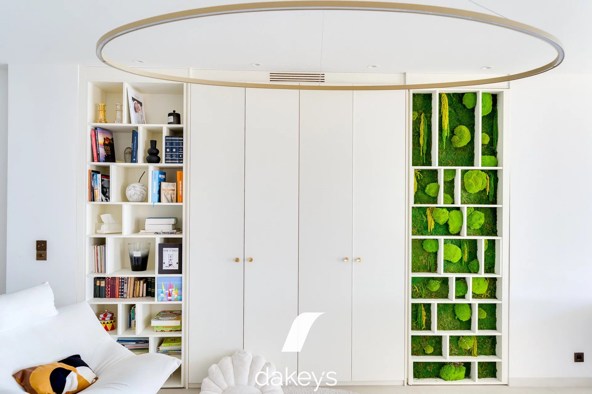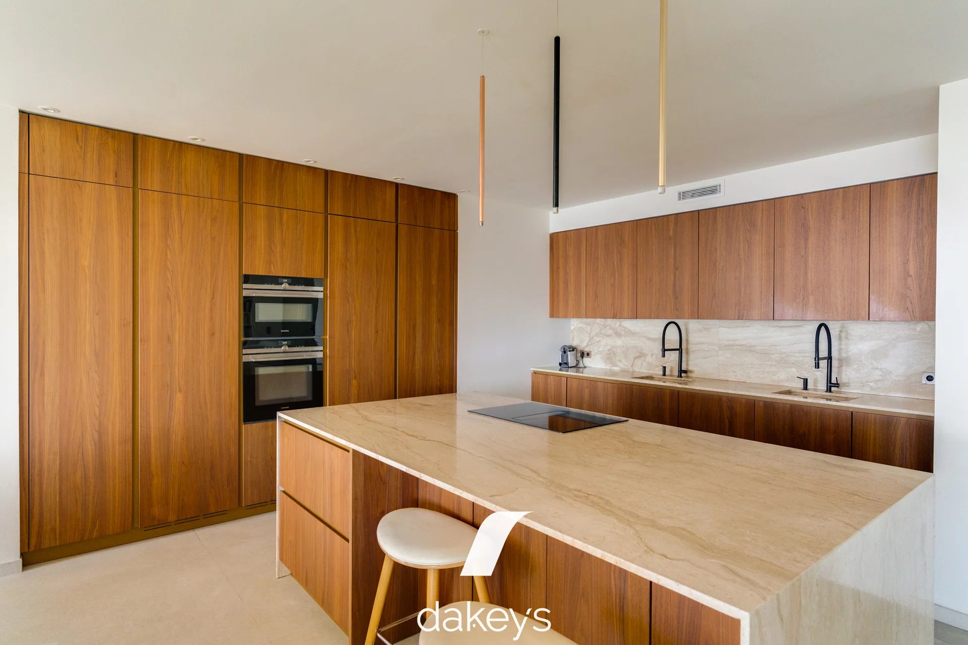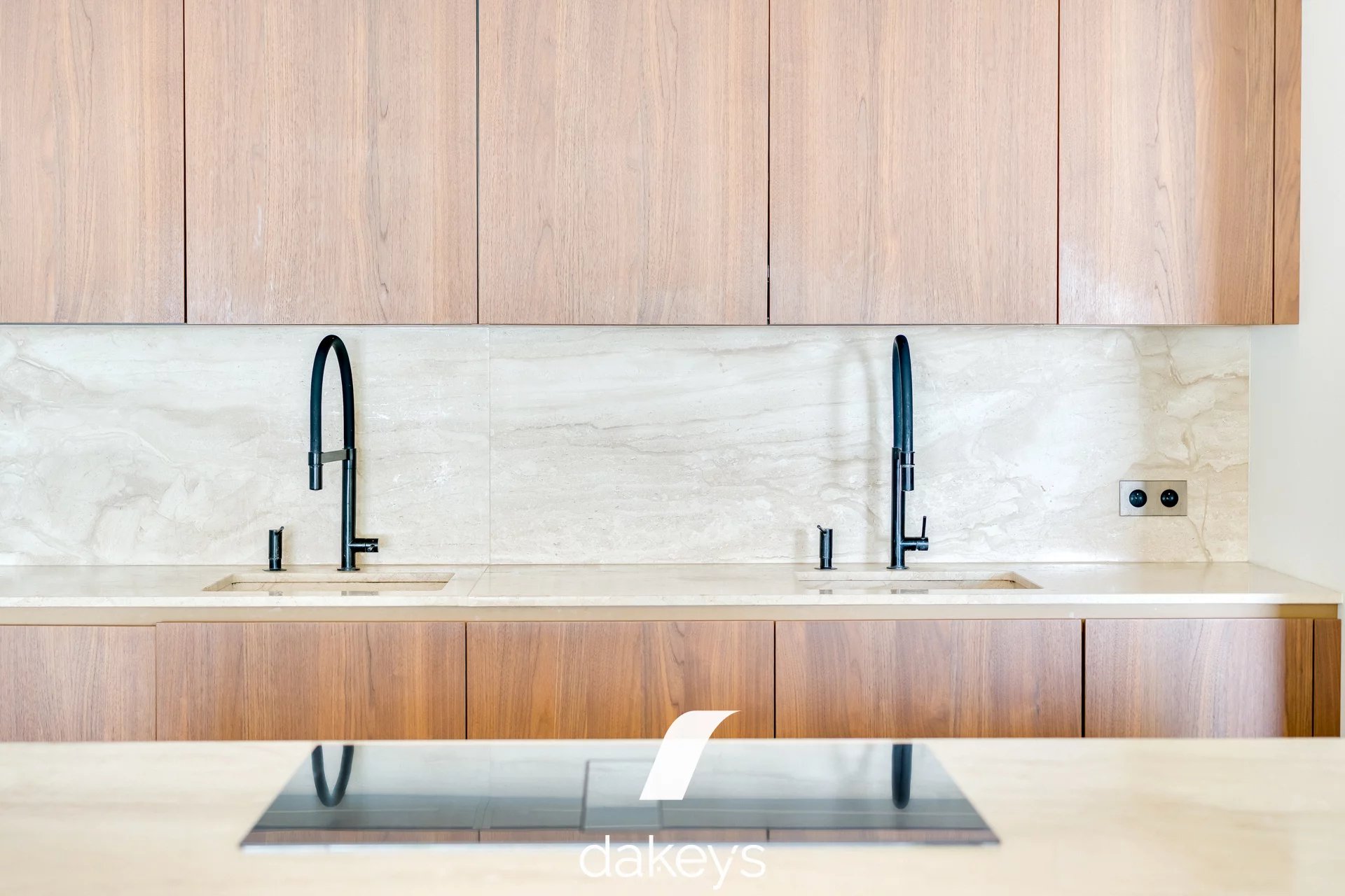 La cuisine ouverte, aux lignes épurées, s’intègre parfaitement à l’espace de vie et reflète une exigence de qualité à chaque détail.