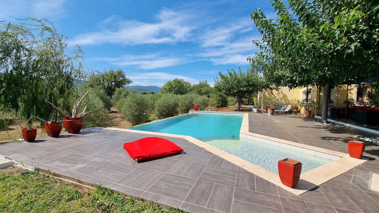 Côté extérieur : une belle piscine à débordement avec vue sur le Coudon et el soliviers, permettant de profiter des moments de détente en écoutant le chant des oiseaux.