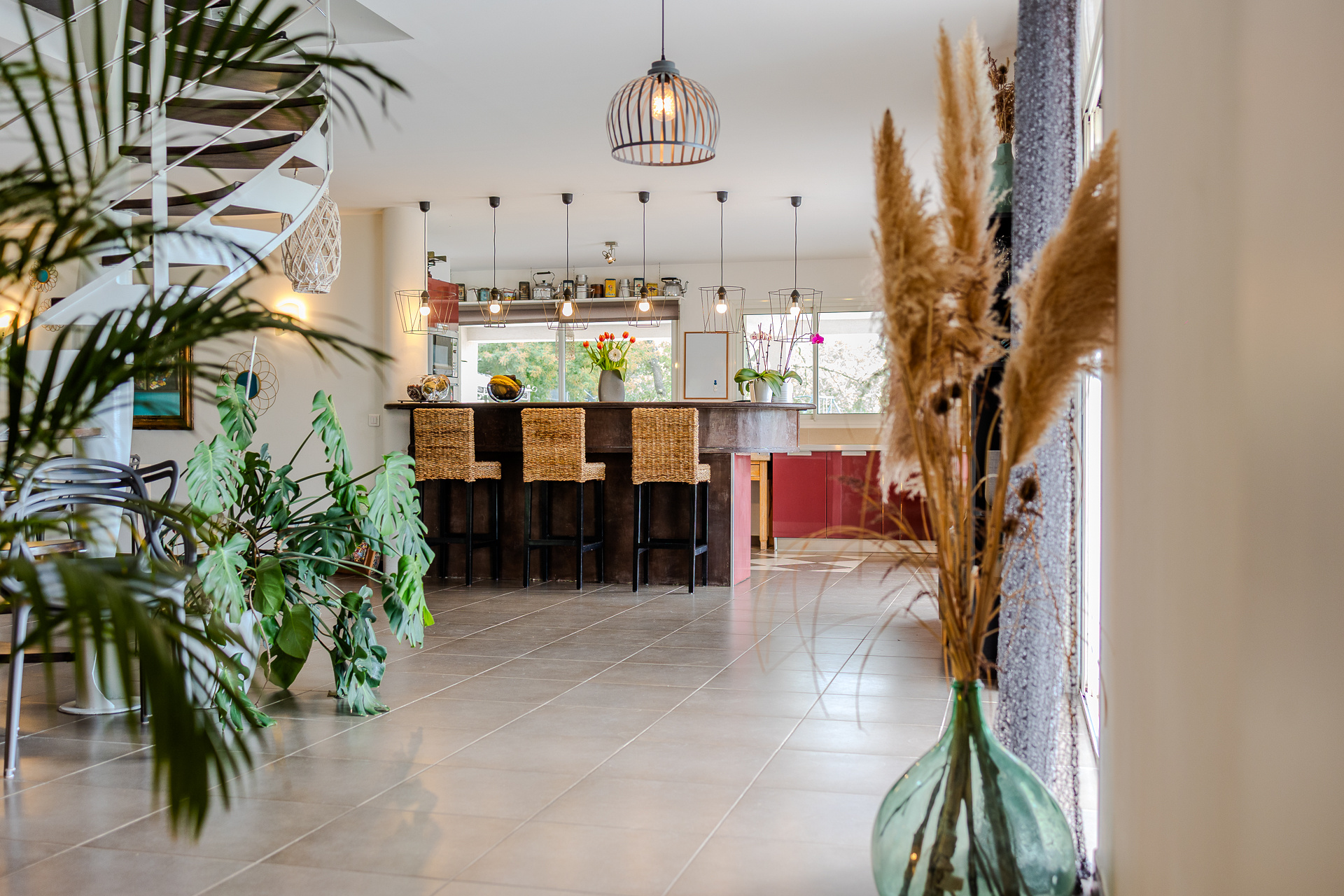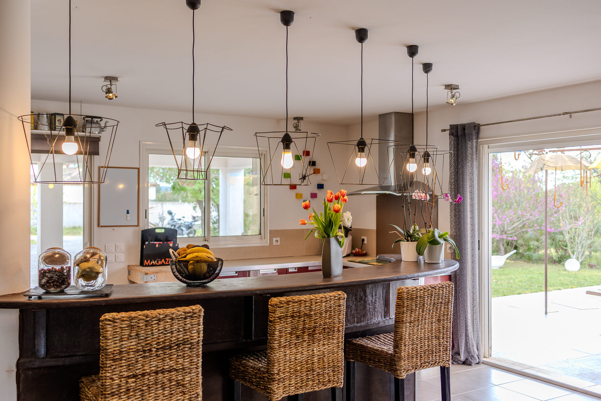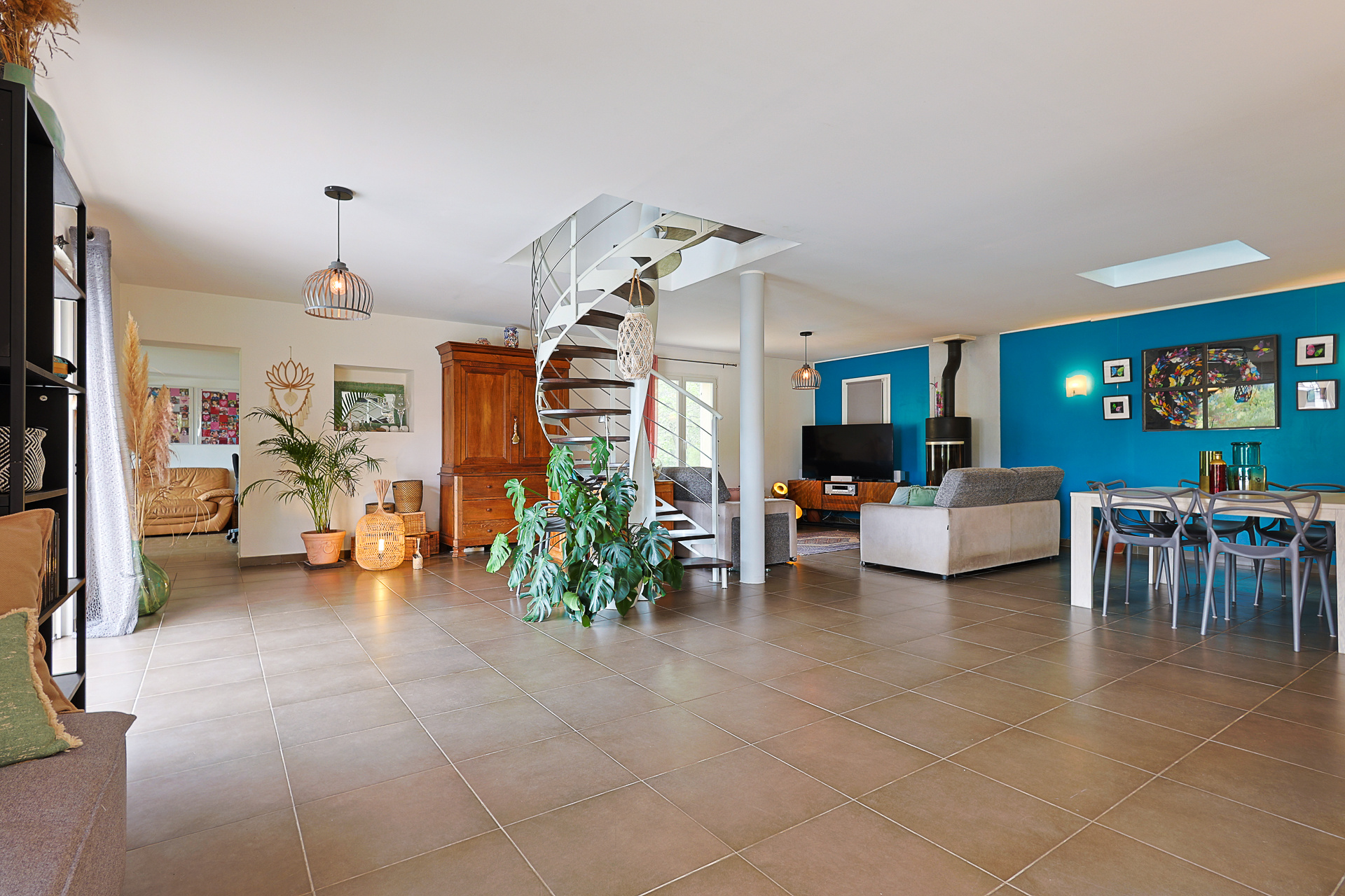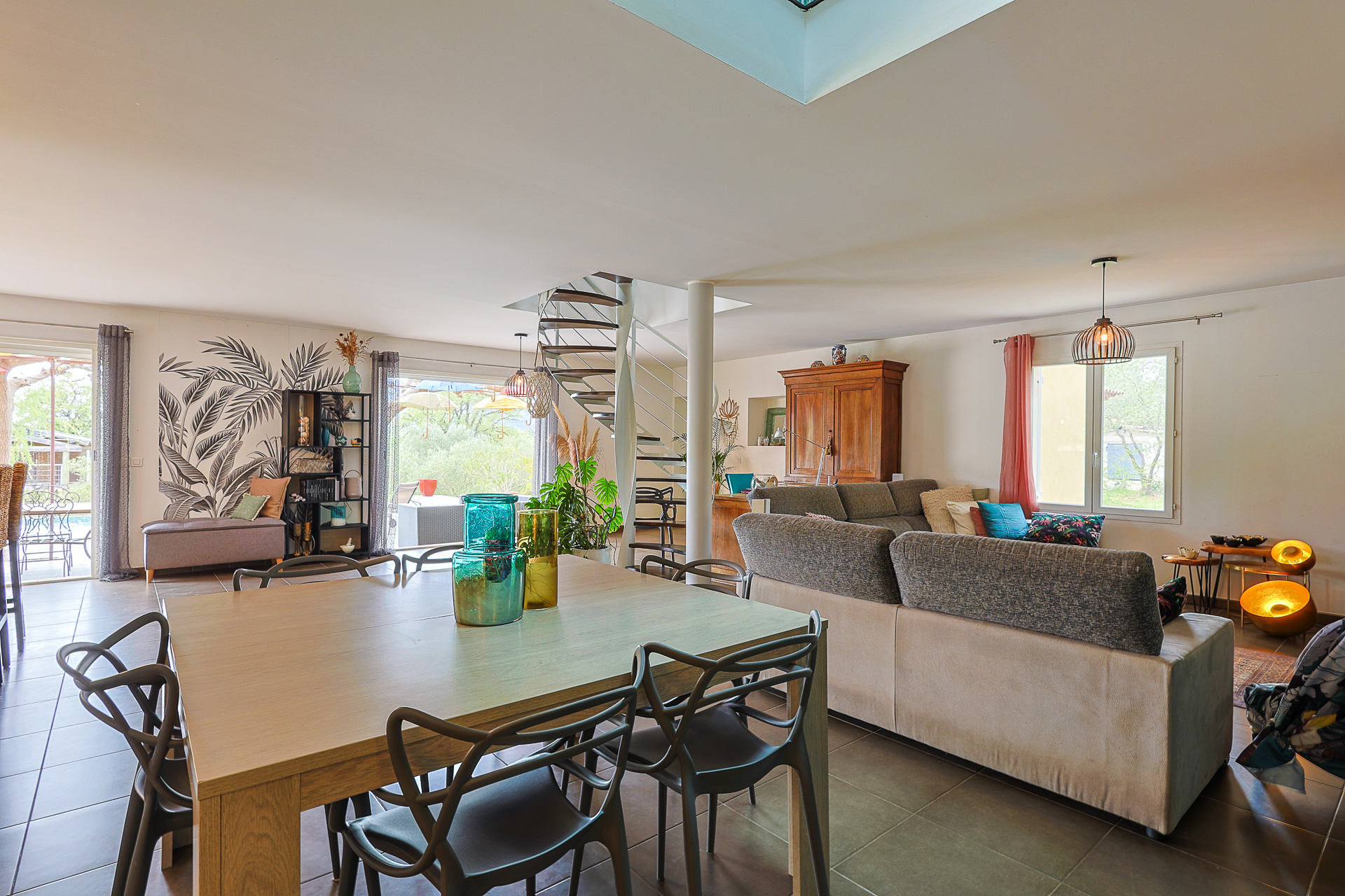 Principalement exposée SUD, elle se compose au rez de chaussée : d'une cuisine aménagée et équipée, avec cellier attenant, ouverte sur un vaste salon/séjour d'environ 65m2 avec baies à galandages faisant face à la pisicne. Le pôle nuit se compose d' un bureau avec mezzanine, 3 chambres d'environ 12.5m2 avec porte fenêtre sur le jardin côté piscine, un grand dressing d'environ 11m2, une SDB avec triple vasque et WC, une sde et un wc..