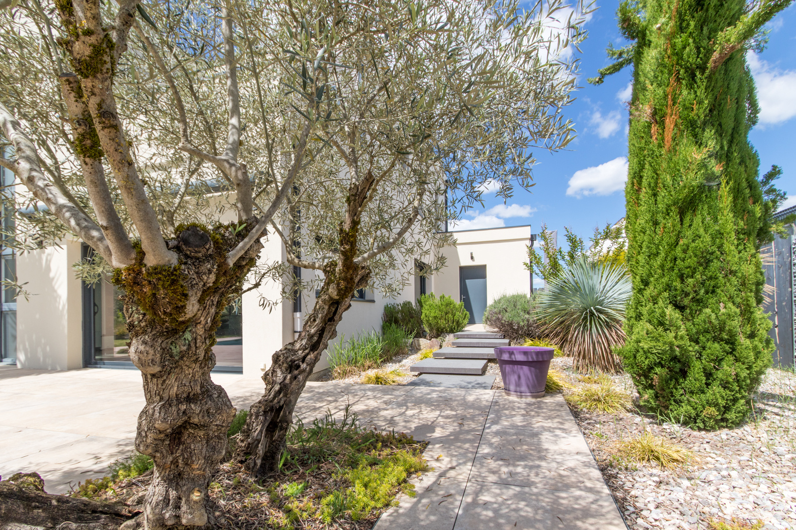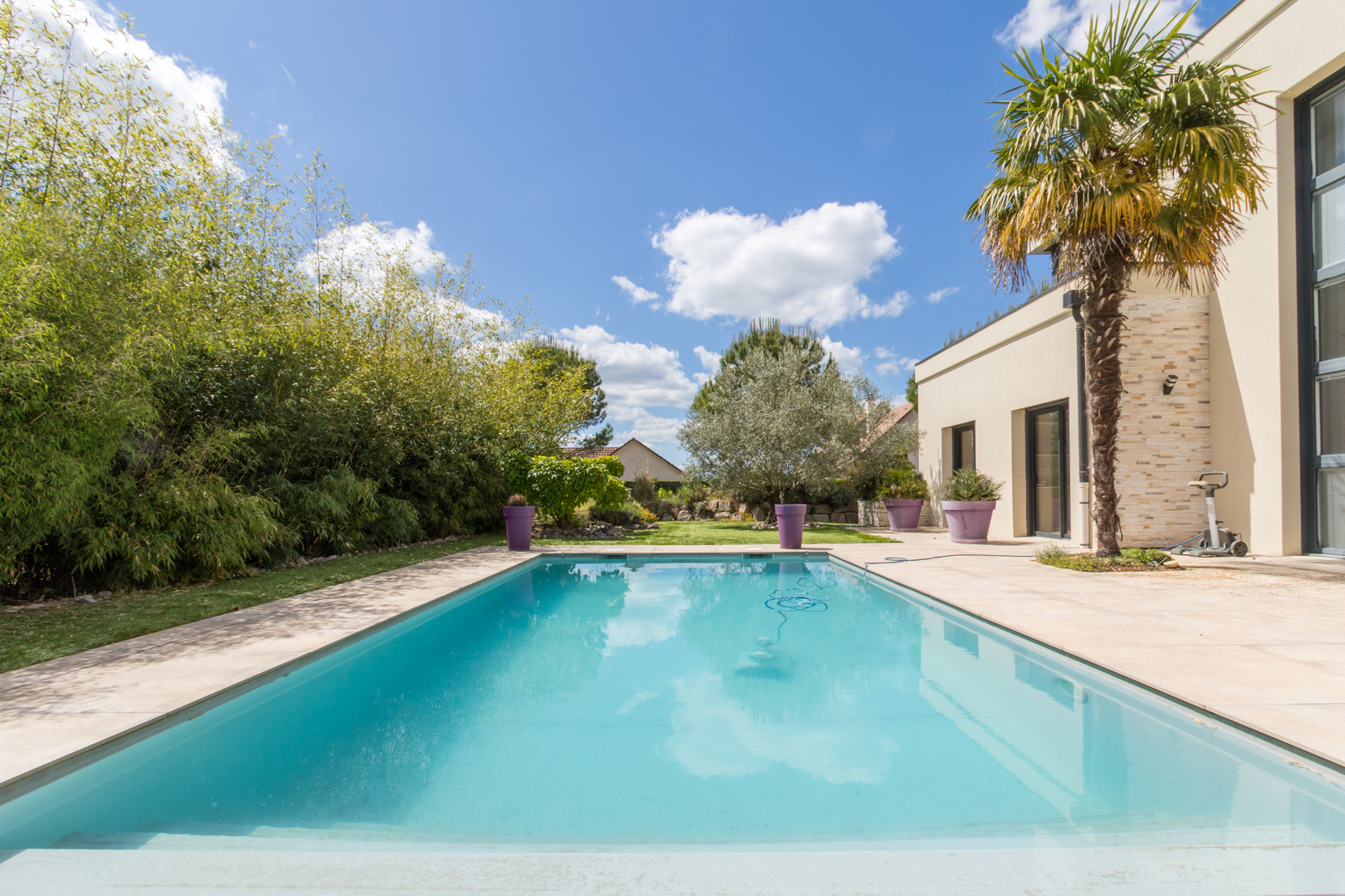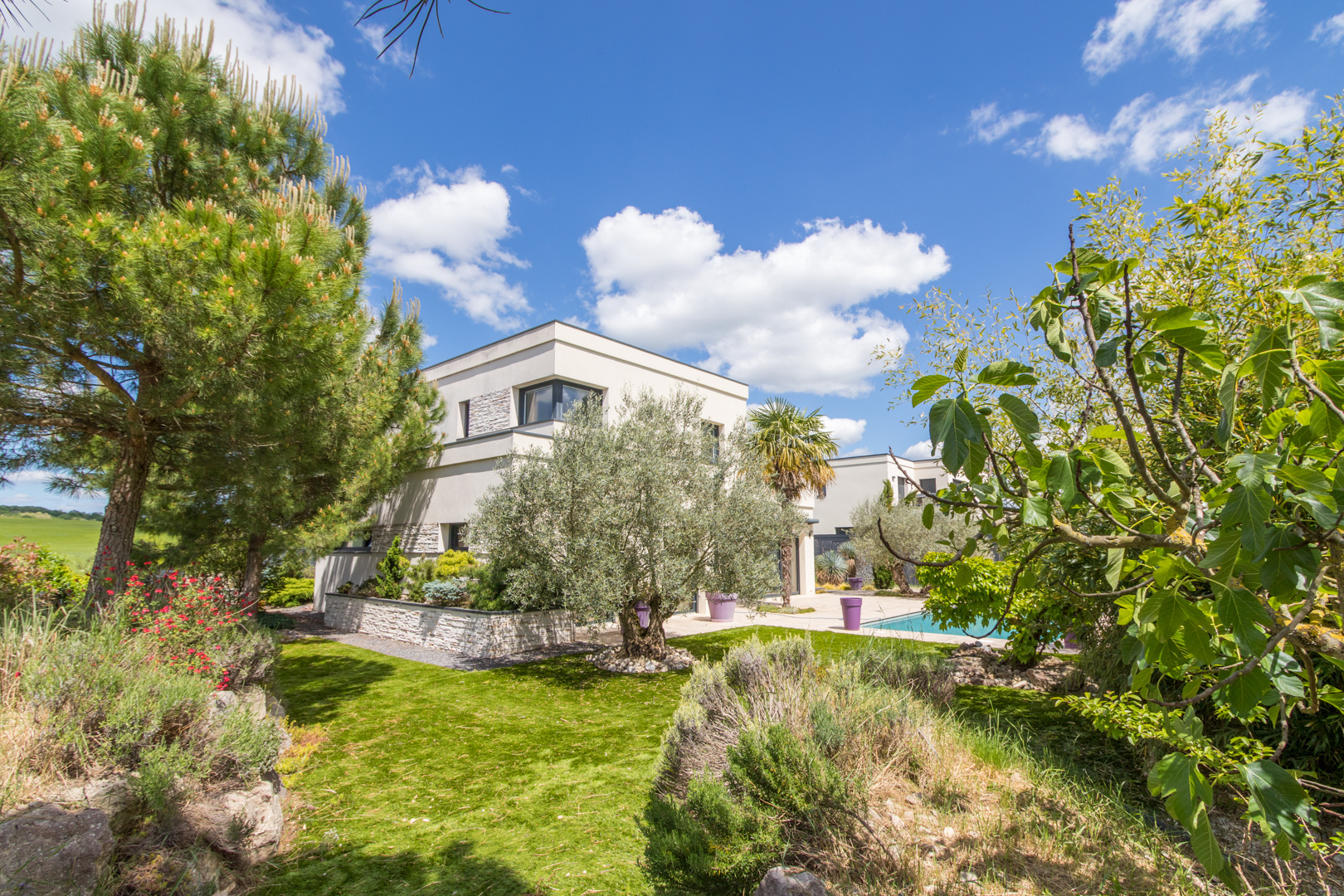 Dans un écrin de verdure, superbe maison d'architecte aux lignes épurées et aux prestations très soignées donnant sur jardin paysagé avec piscine chauffée.