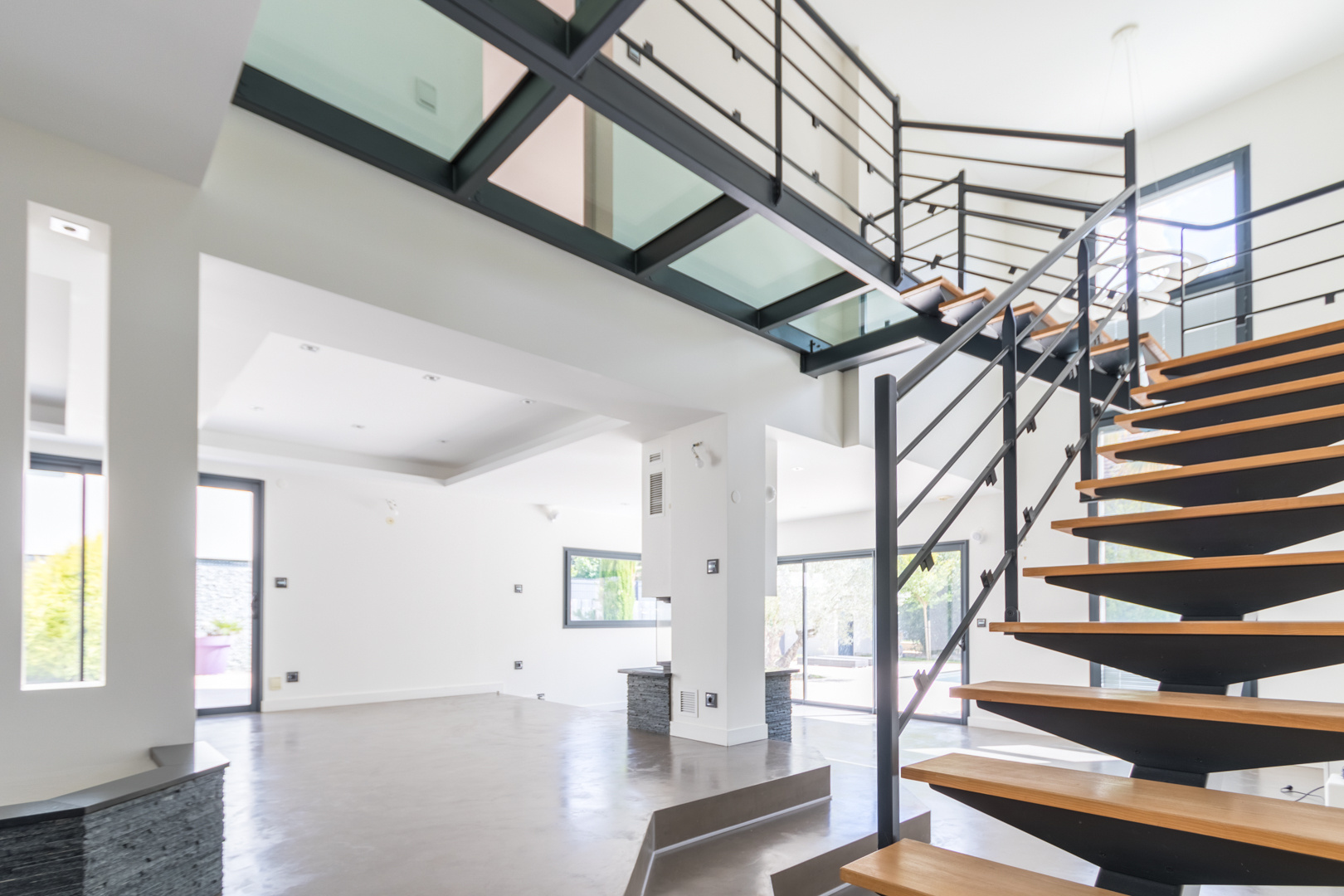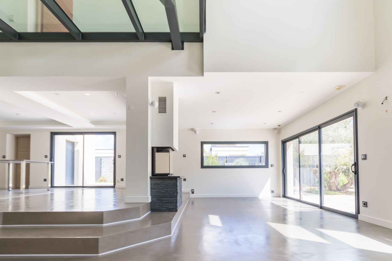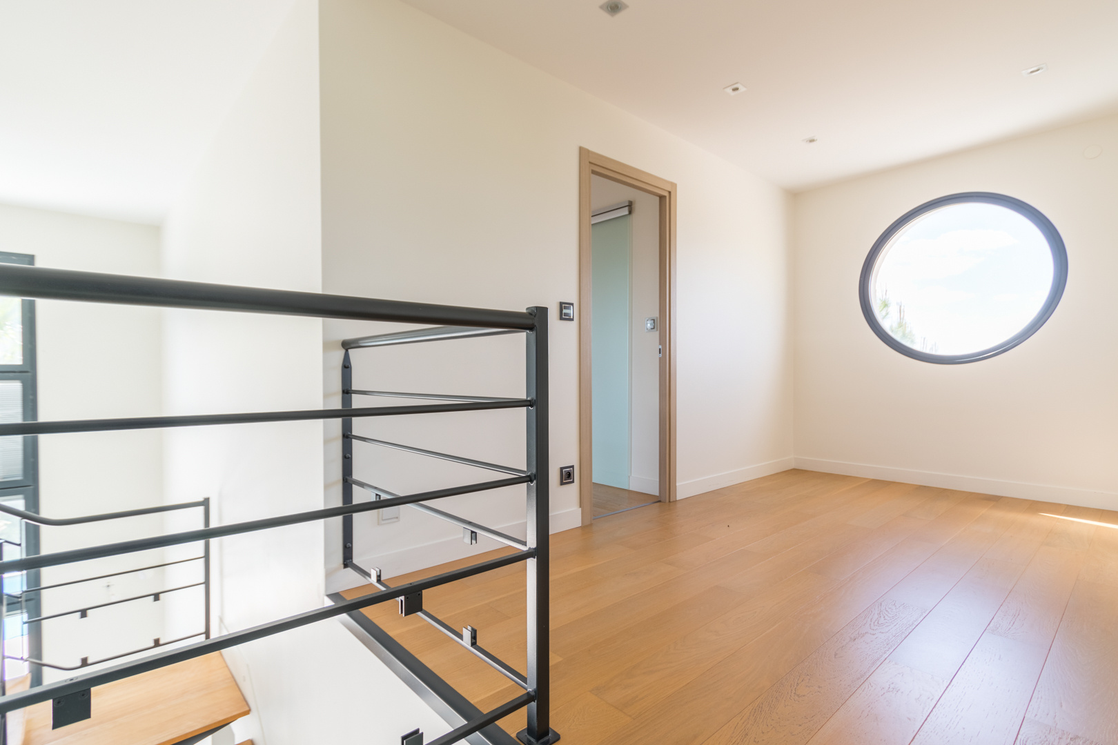 Vous serez séduits par un bel espace de vie comprenant un séjour cathédrale baigné de lumière avec cuisine ouverte contemporaine, quatre chambres en suite dont une de plain-pied, bureau, salle de sport ou 5ème chambre.