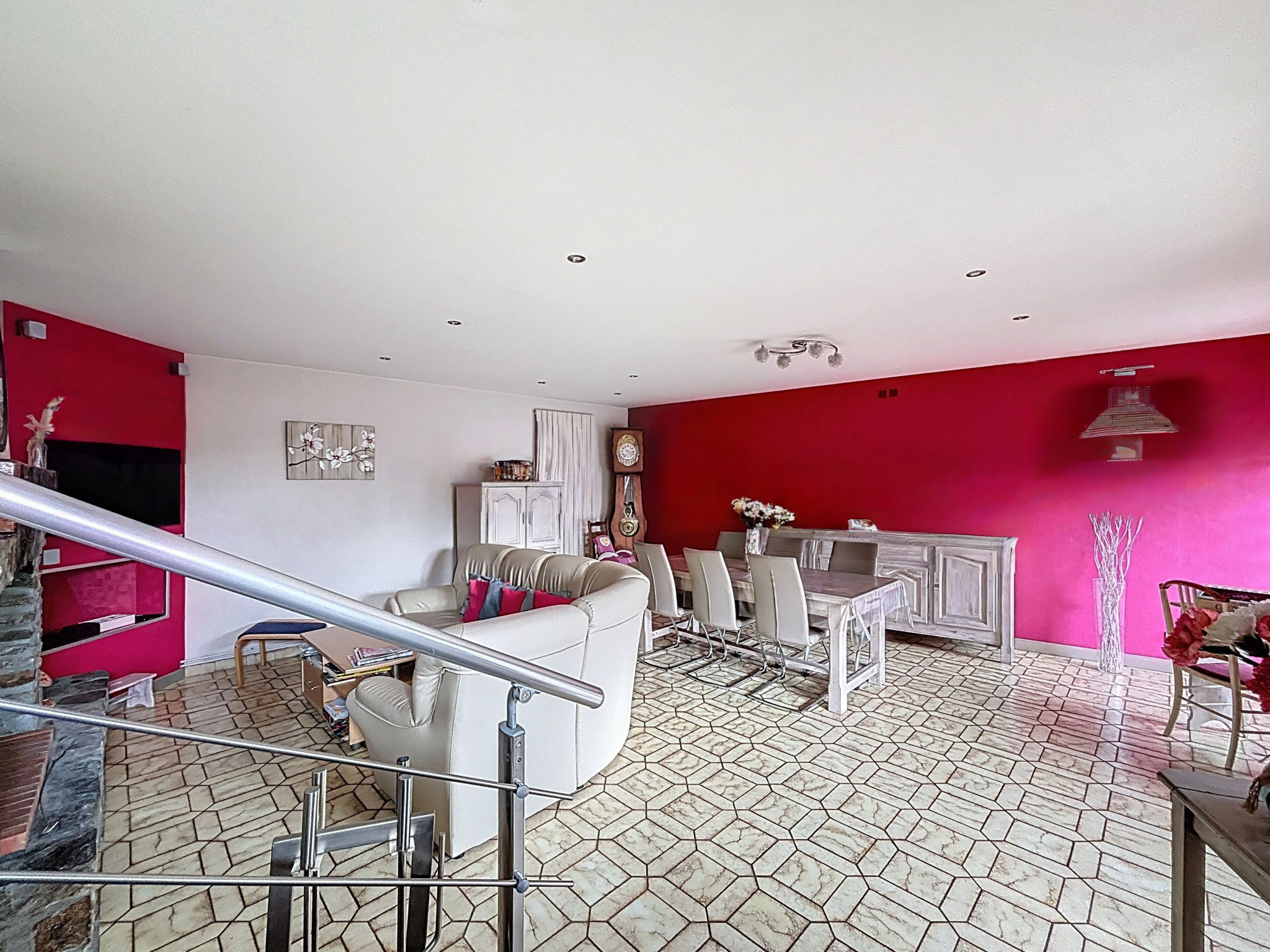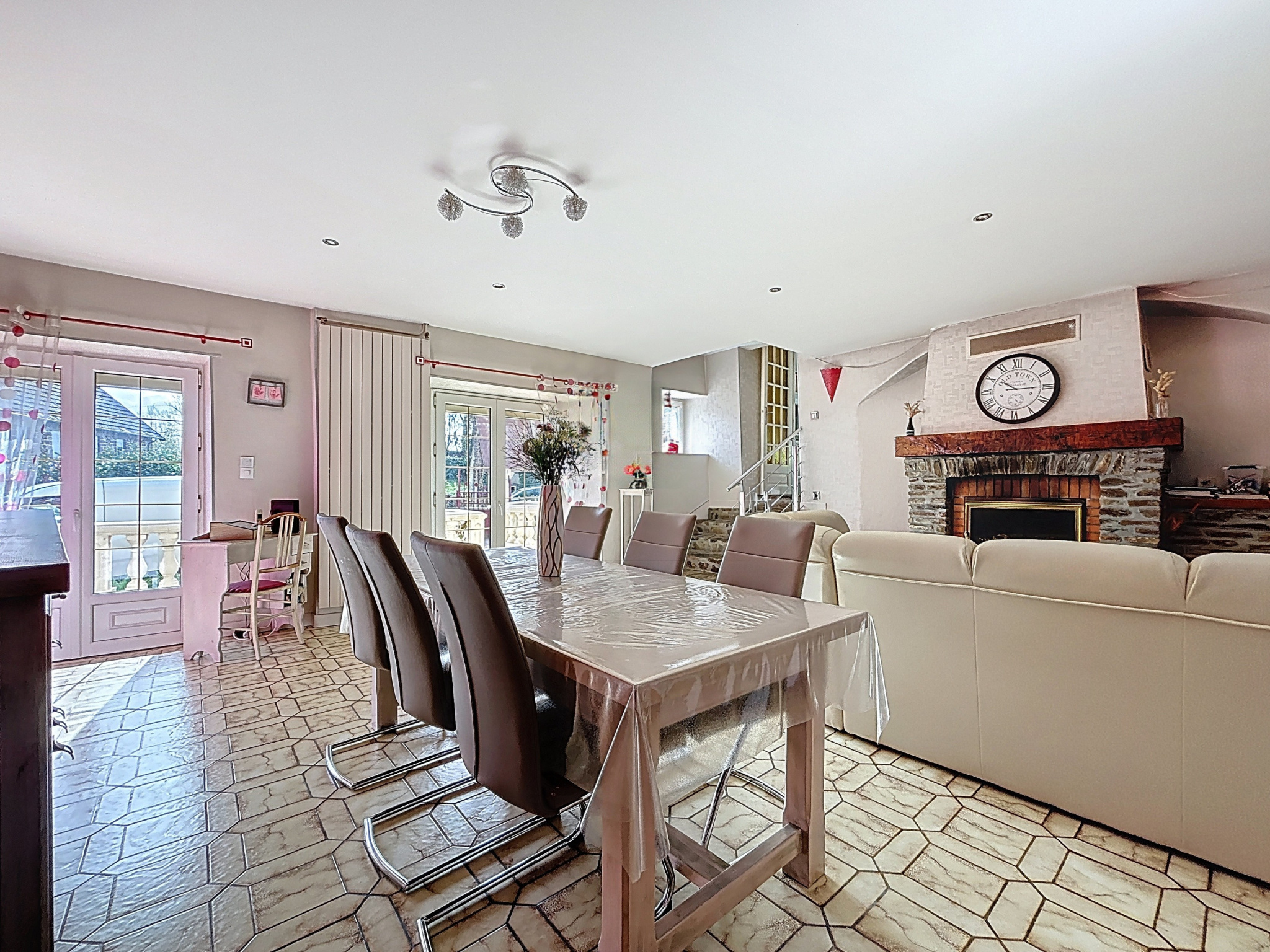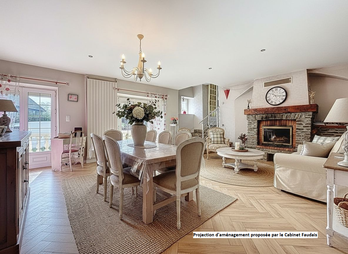 La maison se compose d'un grand hall d'entrée, d'une cuisine indépendante, aménagée et équipée. Dans le prolongement de la cuisine, quelques marches vous conduisent vers un bel espace de vie composé d'un salon et d'une salle à manger avec une cheminée avec insert à bois, un WC, un cellier et une chaufferie.