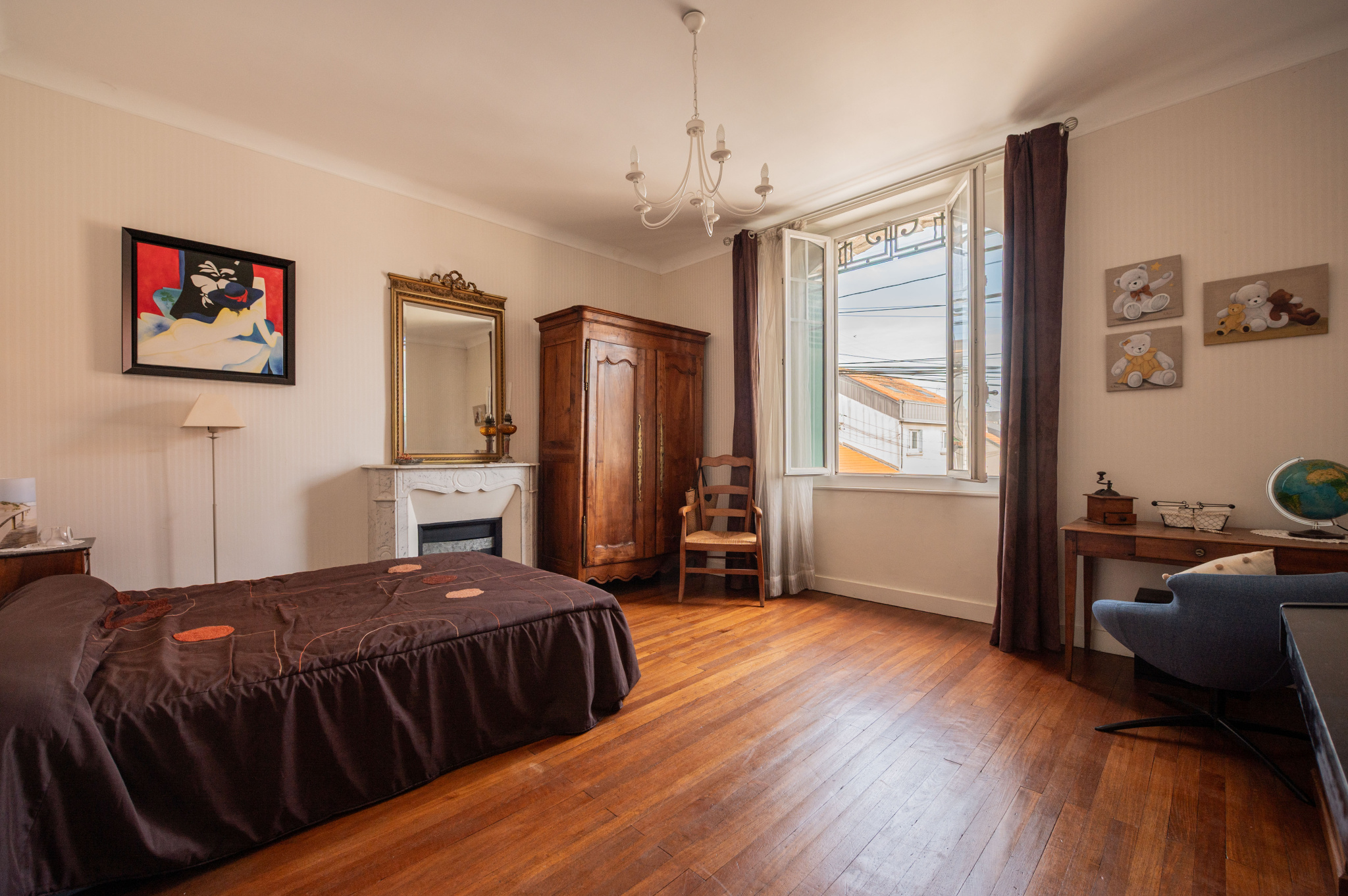 -Au premier étage : un palier distribuant trois grandes chambres, une salle de bains avec wc et une grande loggia.
