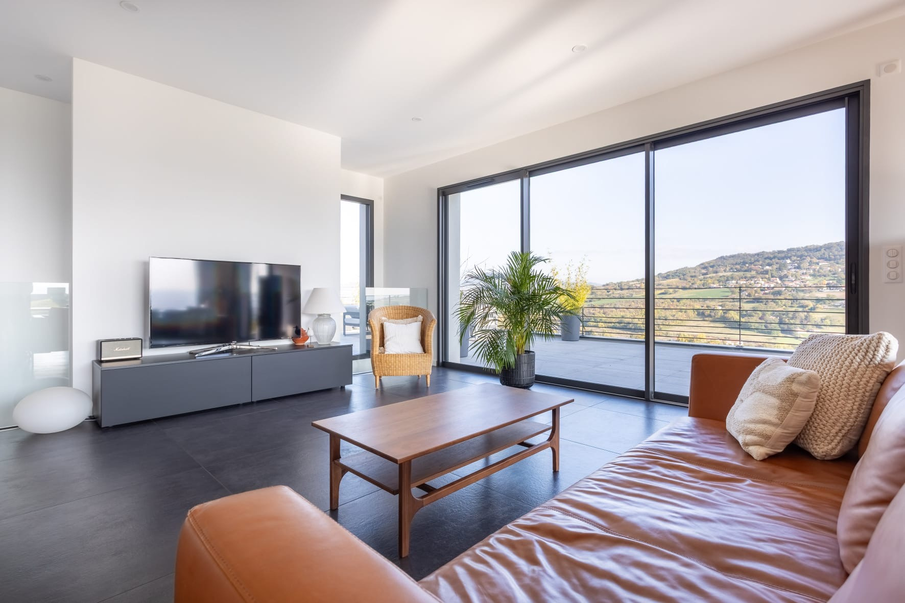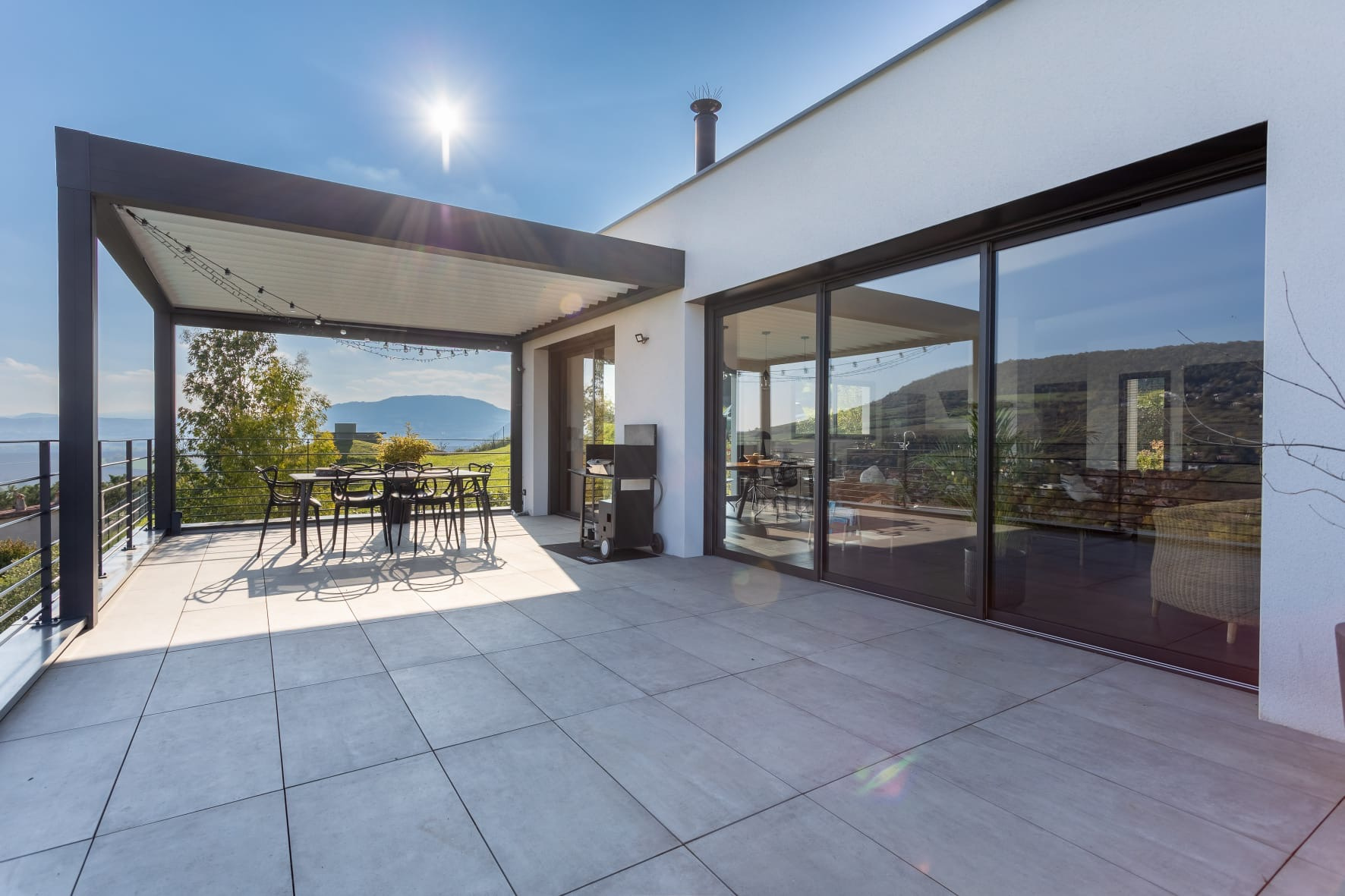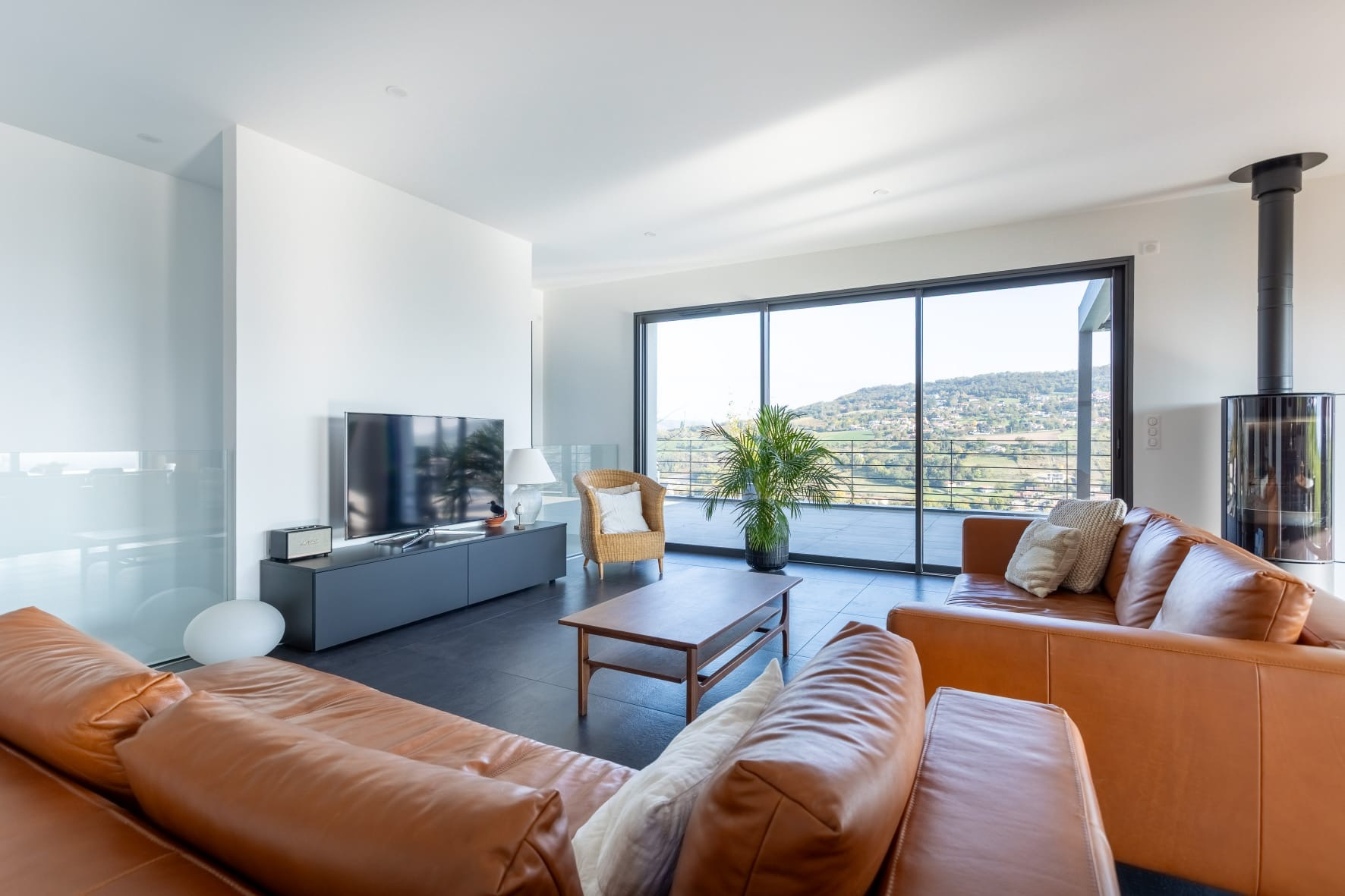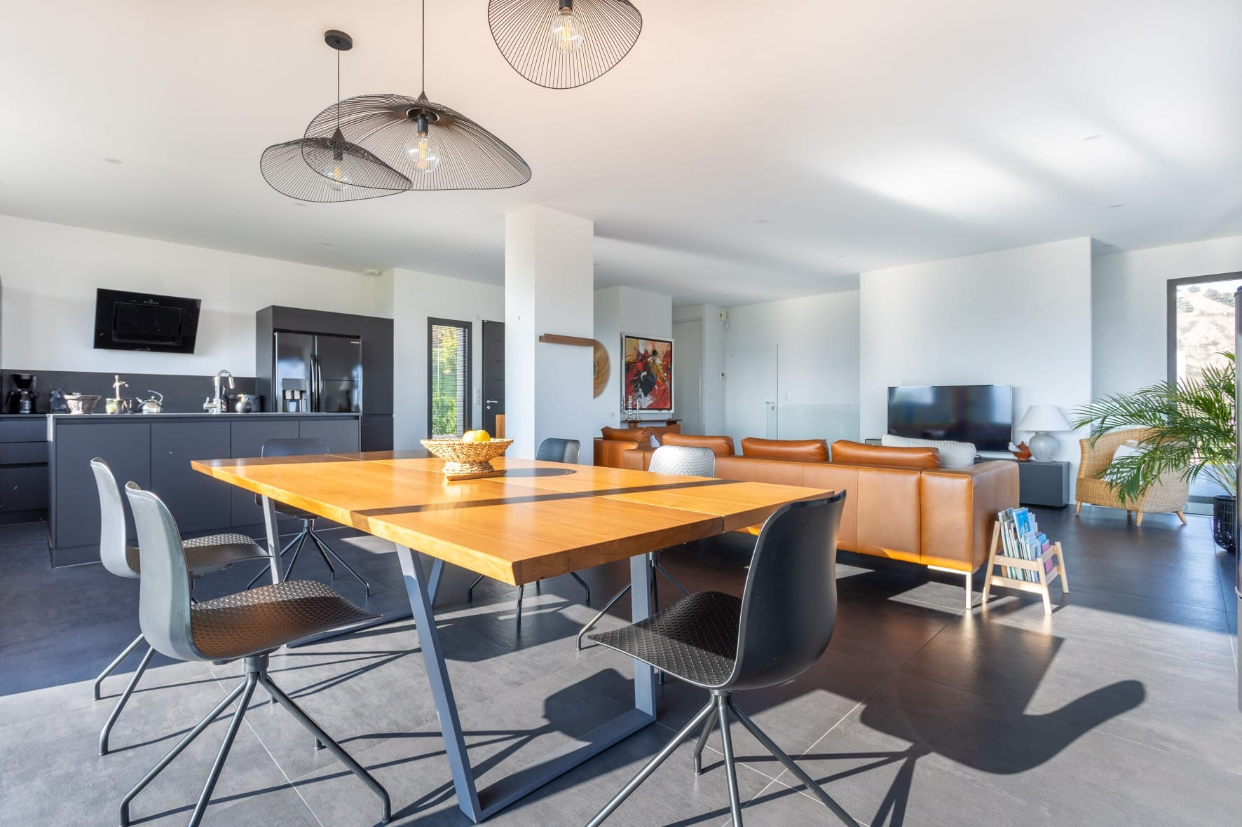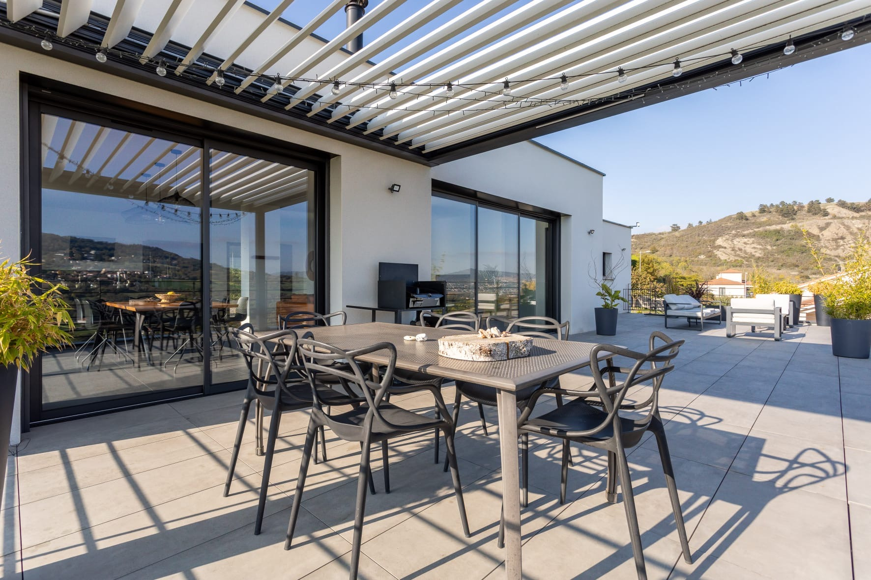 La maison se compose comme suit : une entrée avec rangements et wc séparé avec lave main donne sur la grande pièce de vie ouverte lumineuse, avec hauteur sous plafond et baies vitrées, de près de 70m2. Cuisine équipée haut de gamme avec nombreux rangements, plans de travail en granit, poêle à bois pour le confort et la chaleur de la flamme, grandes baies vitrées et accès à la grande terrasse de 70m2 avec pergola bioclimatique, offrant une vue rare et un espace de vie extérieur pour profiter des moments en famille ou entre amis.