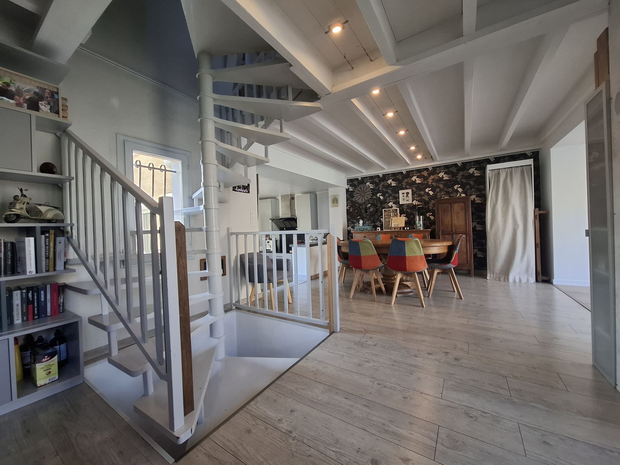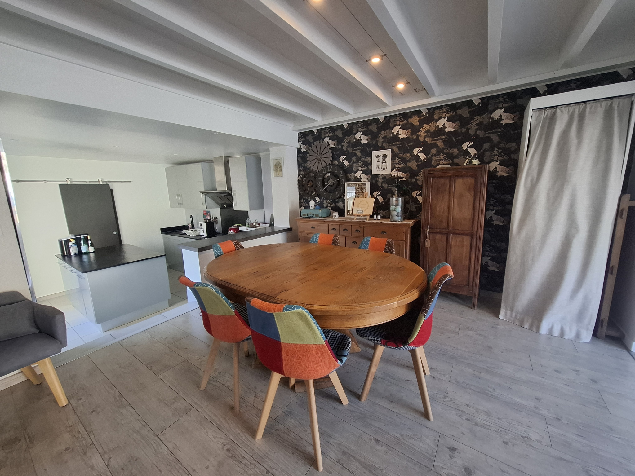On descend quelques marches sur une cuisine JEAN DE MATHIEU ouverte de 11.68 m2 aménagée et équipée avec un îlot central et 2 portes fenêtres PVC double/vitrage et volets roulants motorisés dont une donnant sur une petite cour à l'arrière de la maison avec une partie couverte pour entreposer le bois et un chalet métallique avec électricité.