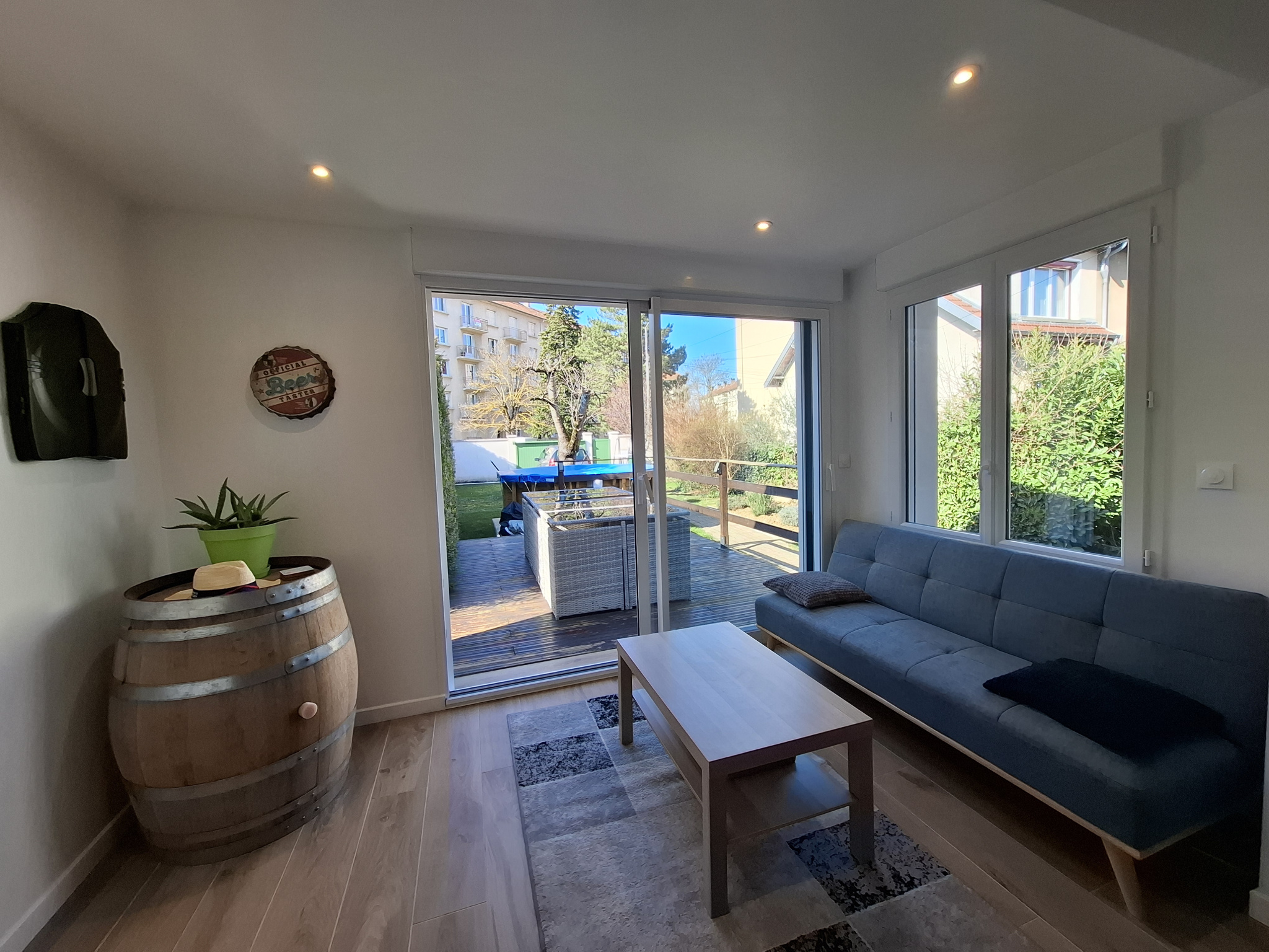 Elle se compose au rez-de-chaussée d'une grande pièce à vivre de 35.65 m2 avec une partie salon avec une cheminée et la climatisation réversible et d'une partie séjour avec l'aménagement d'une extension de 8.20 m2 en remplacement d'une véranda des années 1980 avec 2 fenêtres PVC double/vitrage et volets roulants motorisés dont une qui s'ouvre sur une terrasse aménagée en bois de 12 m2 suivie d'une marche menant à la piscine hors-sol à l'avant de la maison exposition Sud/Est.