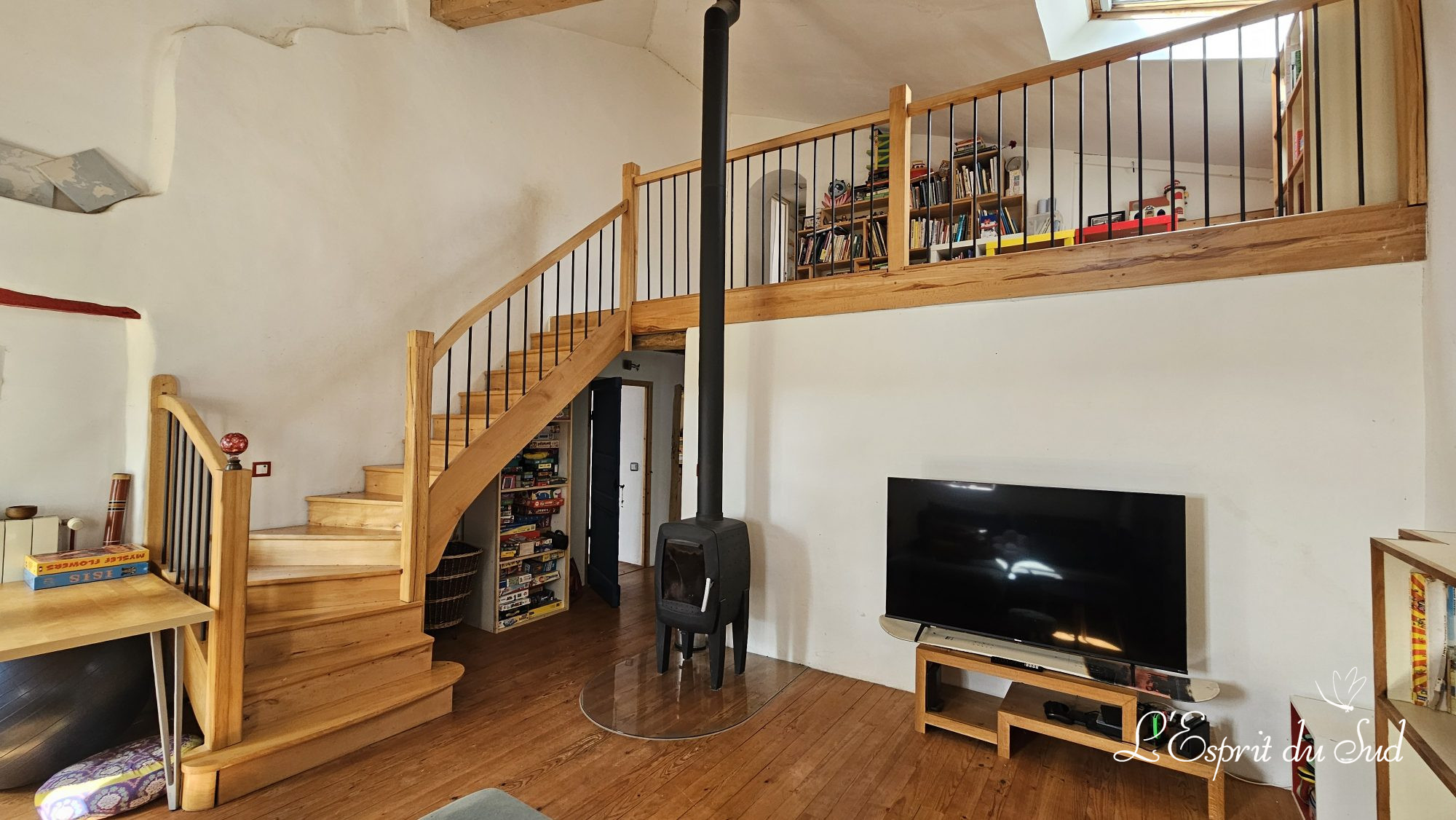 Au rez-de-chaussée de cette maison ancienne, vous trouverez tout le le nécessaire : un séjour avec sa magnifique et grande cheminée, la cuisine ouverte, le salon déplafonné avec son poêle à bois et son ouverture sur une des terrasses, une grande chambre et une salle de bain.