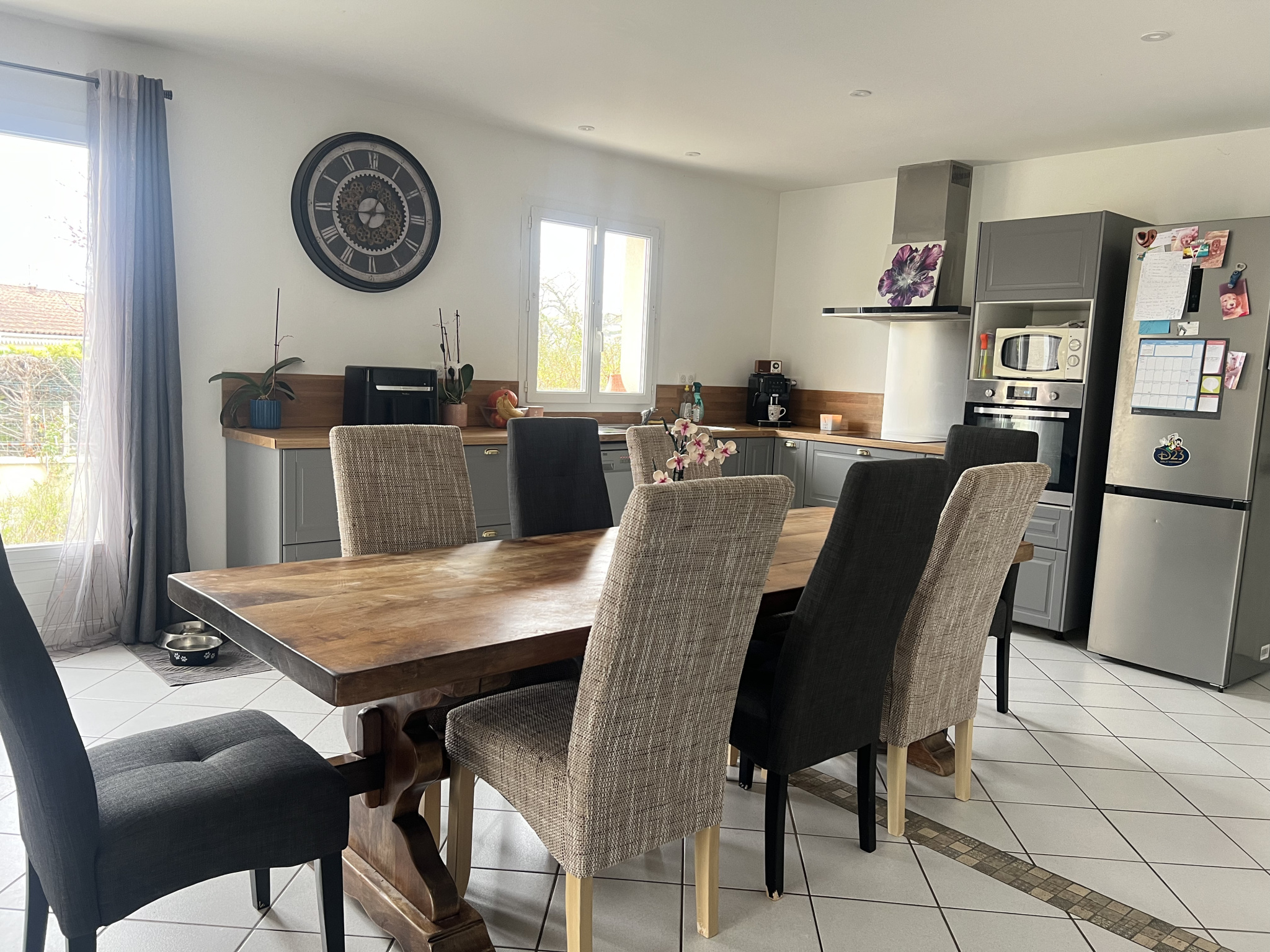 La cuisine américaine, aménagée et fonctionnelle, s'ouvre harmonieusement sur l'espace de vie et dispose d'un cellier attenant pour plus de praticité.