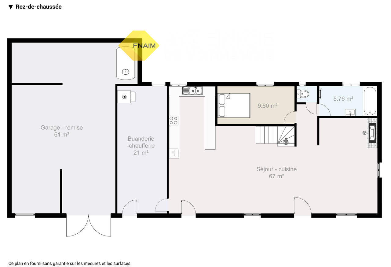 La maison offre environ 119 m² habitables et une organisation fonctionnelle permettant une vie de plain-pied. Le rez-de-chaussée s’articule autour d’une vaste pièce de vie de 67 m² avec cheminée et cuisine équipée, une chambre ainsi qu'une salle de bains et des wc. Une grande buanderie et un garage attenant complètent ce niveau. À l’étage, le palier dessert trois chambres supplémentaires ainsi qu’une salle de douche avec wc.