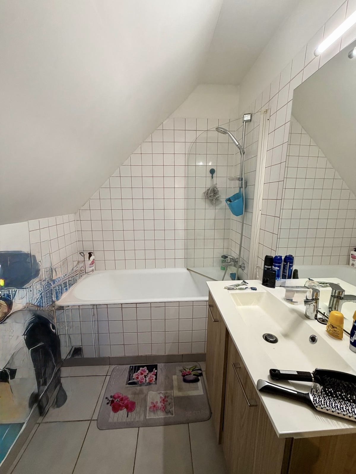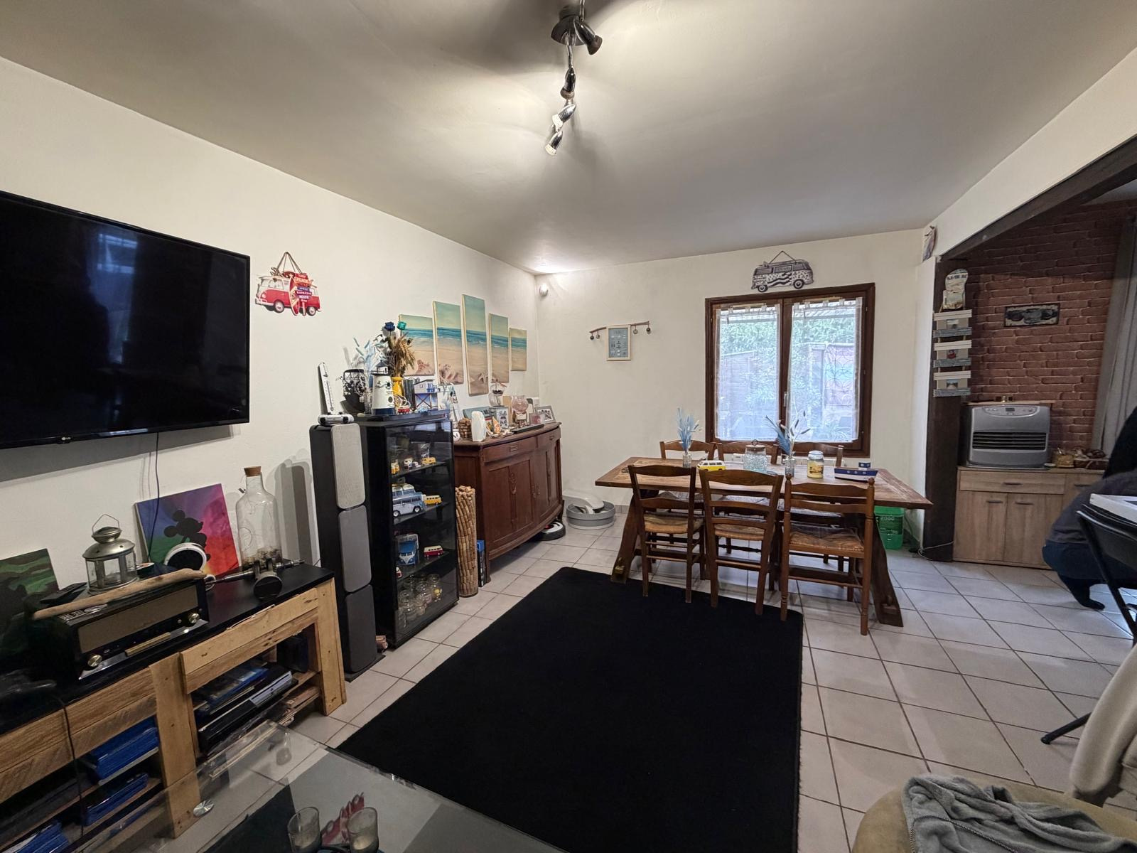 Au rez-de-chaussée : entrée sur une spacieuse et lumineuse pièce de vie avec cuisine aménagée et équipée (plaque induction, hotte, four, lave-vaisselle), ainsi qu'une salle d'eau avec WC. À l'étage, vous trouverez deux chambres et une seconde salle d'eau avec WC.