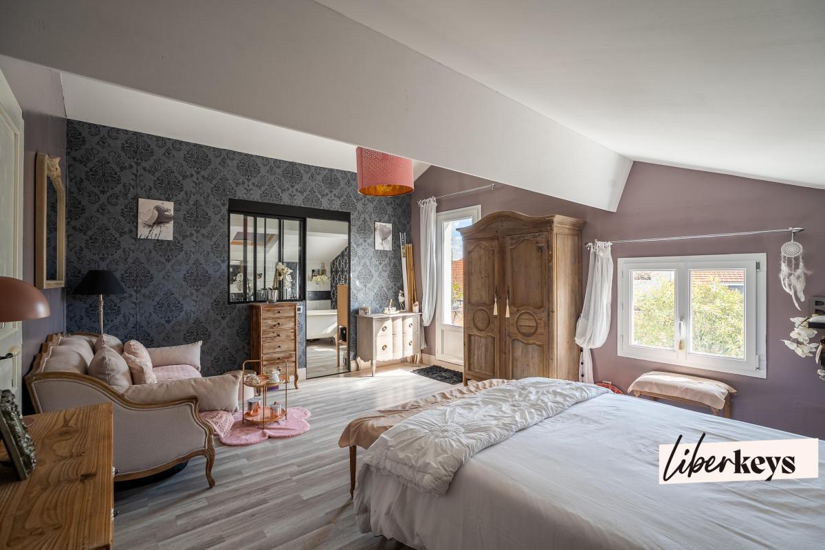 À l'étage, une grande chambre, un espace bureau lumineux en haut de l'escalier et une superbe suite parentale avec salle de bain complète (douche et baignoire sur pied) composent l'espace nuit. Celle-ci s'ouvre sur une terrasse intimiste avec spa, entièrement sécurisée.