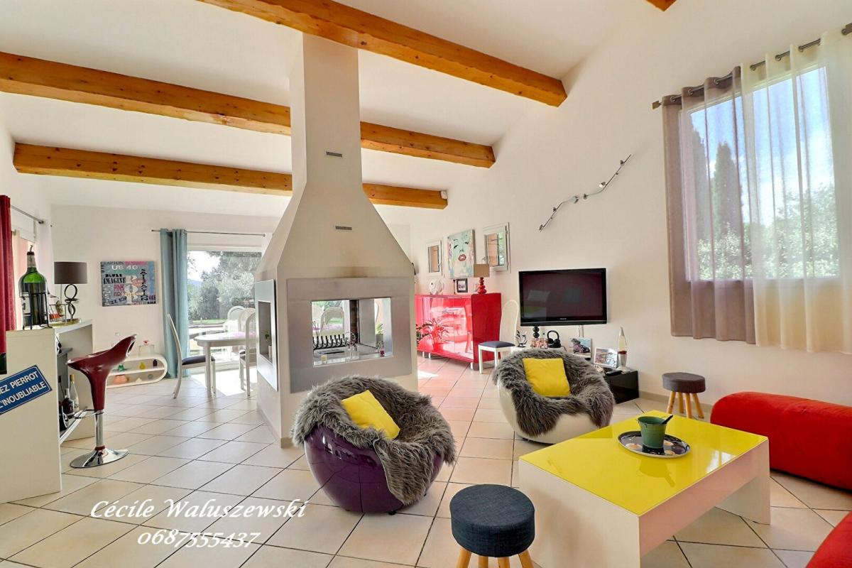 Belles prestations pour cette demeure d'environ 137 m2 plus garage de 45 m2 distribuée de la façon suivante : belle pièce de vie d'env. 83 m2, entrée - cuisine -séjour -salle à manger , donnant sur une parcelle arborée de chênes et d'oliviers.