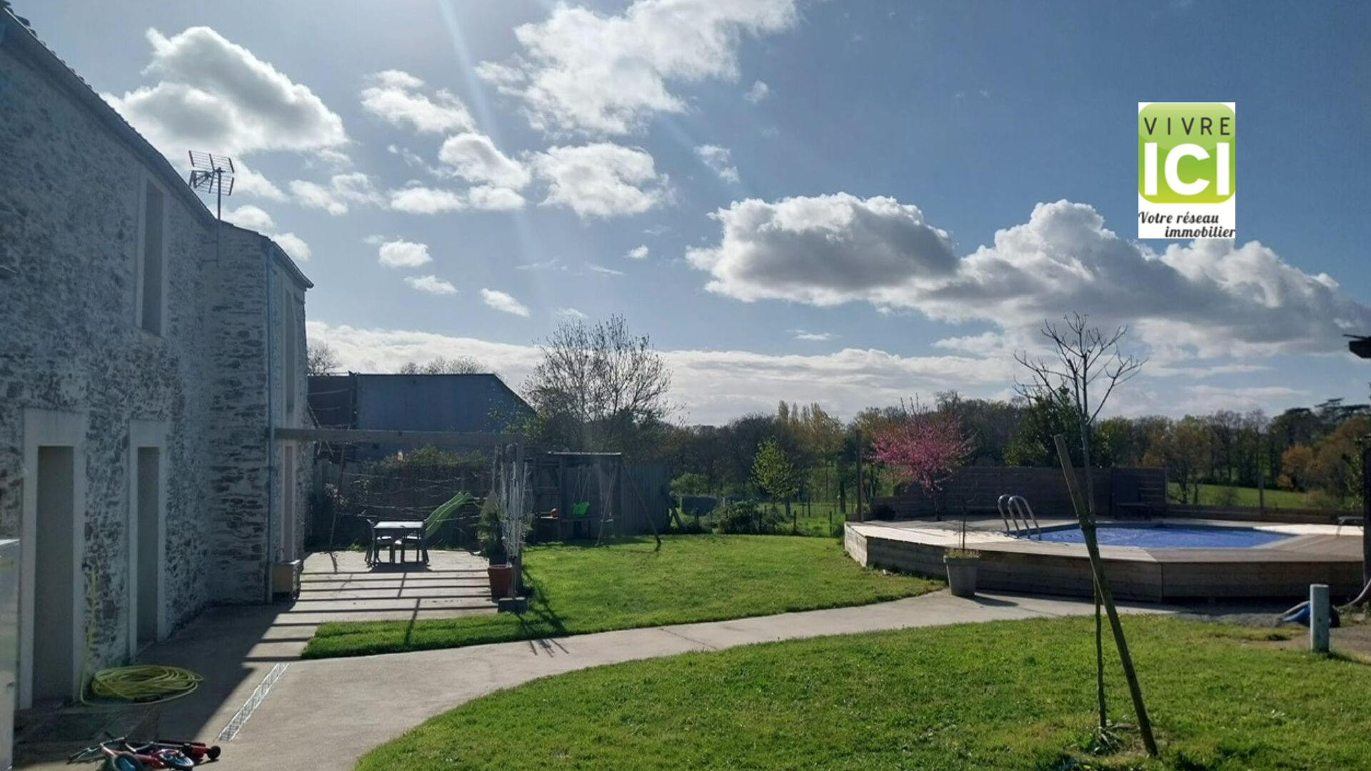 La piscine (avec aérothermie) hors sol et avec terrasse vous permettra de profiter des jours ensoleilés et d'une vue sur la nature.