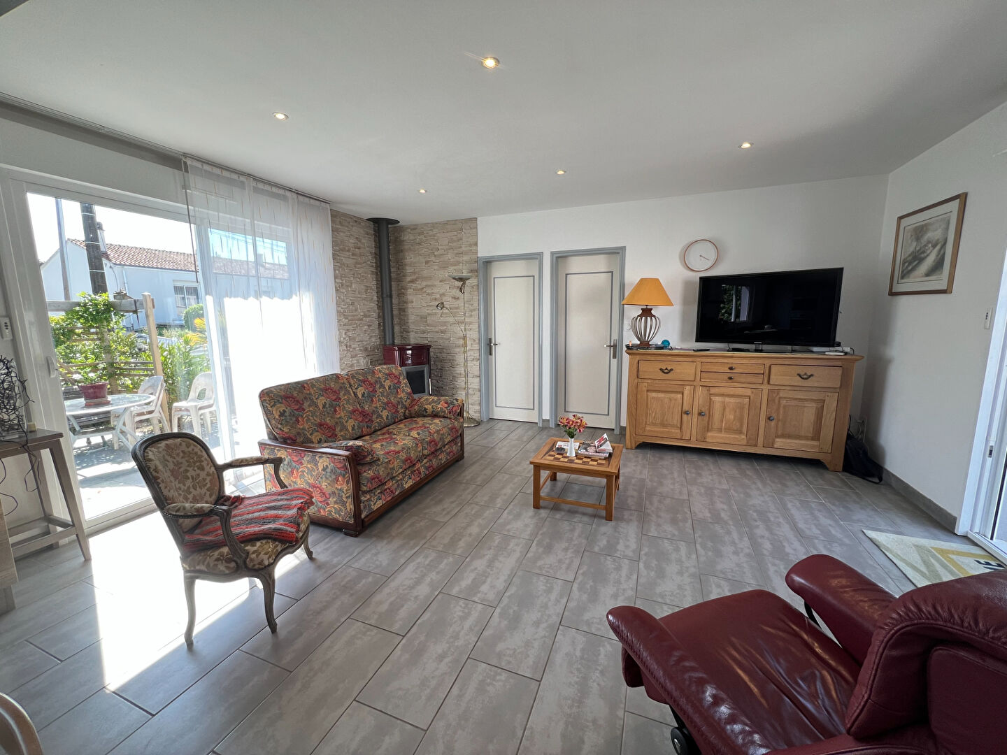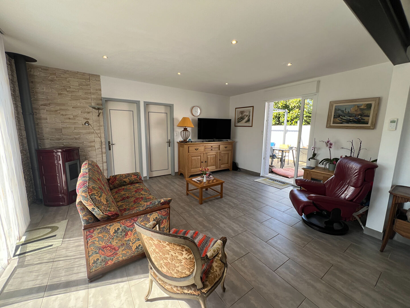 Elle se compose d'une entrée avec grand placard, une cuisine aménagée et équipée, un beau séjour lumineux avec son poêle à granules et ouvrant sur une belle terrasse paysagée, deux grandes chambres, une salle d'eau et 2 wc séparés.