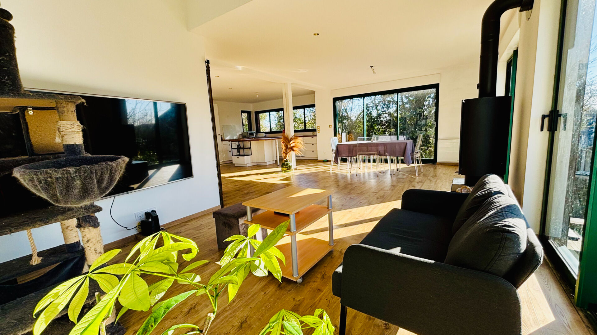 La cuisine ouverte, aménagée et équipée, s'intègre harmonieusement à l'ensemble, sublimée par la présence d'un poêle à bois, apportant chaleur et convivialité à l'espace de vie.
