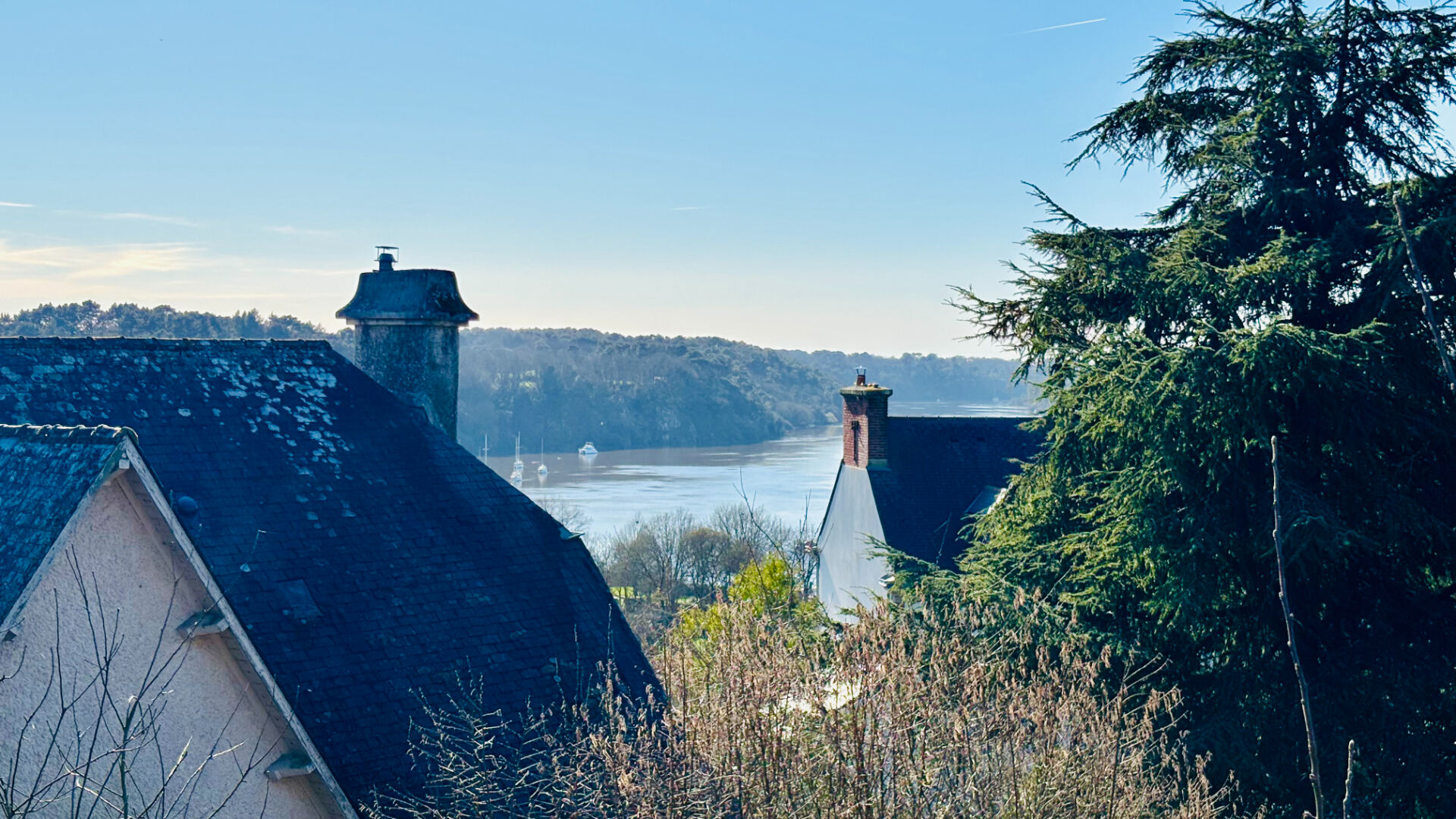 À l'étage, un couloir avec placard dessert deux chambres ainsi qu'une suite parentale, intégrant des placards aménagés, une salle de bains complète avec baignoire et douche, et offrant une vue dégagée sur la Vilaine, conférant à cet espace un caractère à la fois privilégié et apaisant.