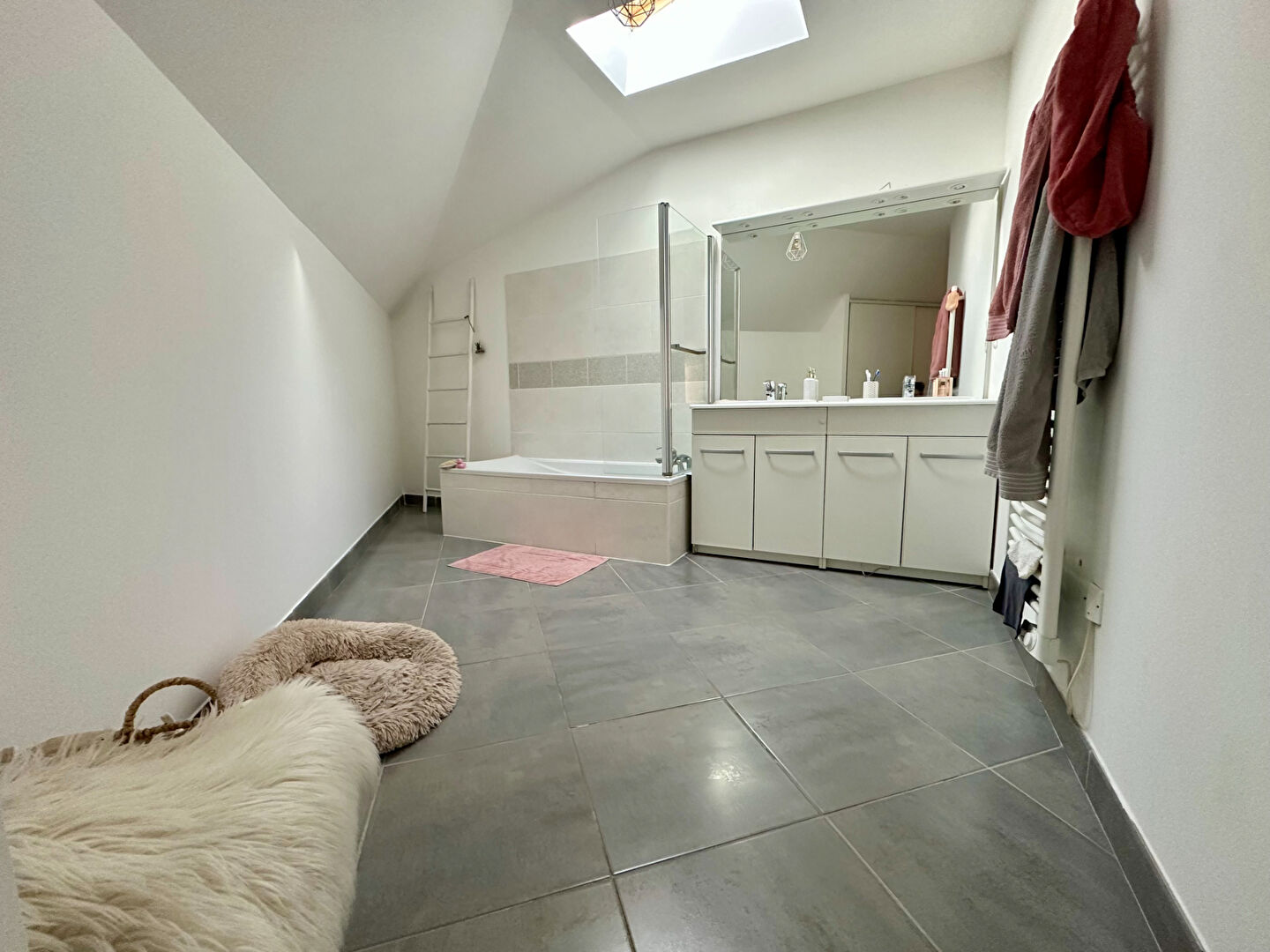 À l'étage, palier desservant trois chambres dont une avec salle d'eau, WC indépendant, grande salle de bains avec rangements.