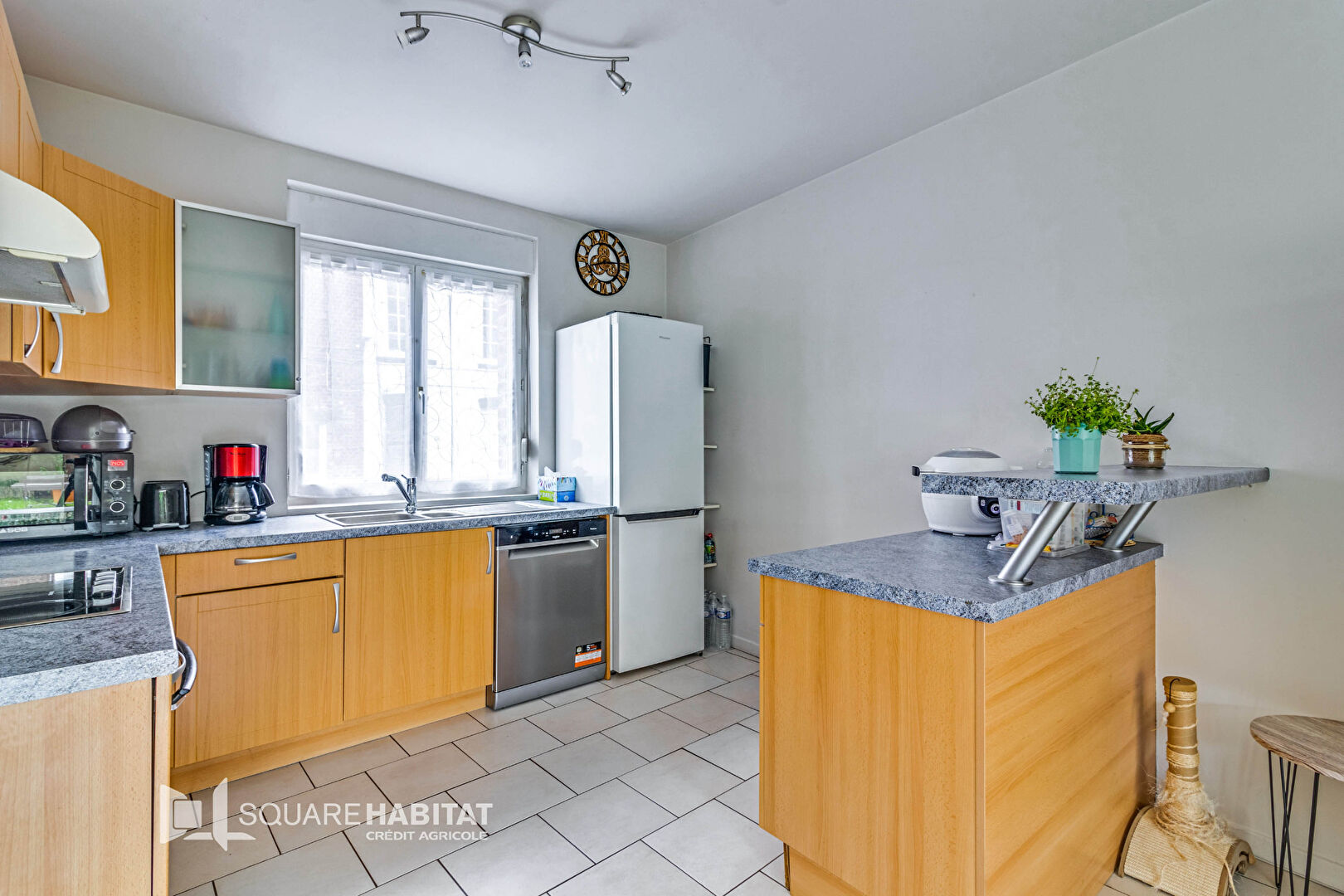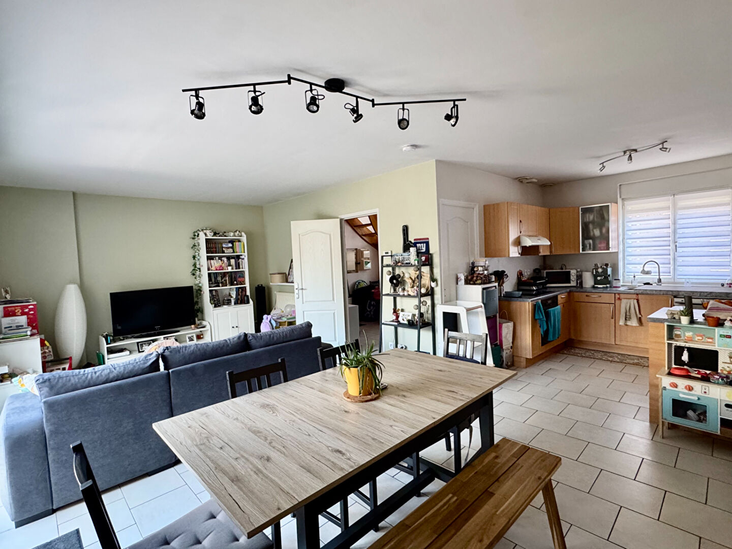 Elle se compose d'un hall d'entrée avec des wc, d'une belle pièce de vie lumineuse avec une vue sur un jardin bien exposé et à l'abri des regards, ainsi que d'une grande cuisine équipée et ouverte.