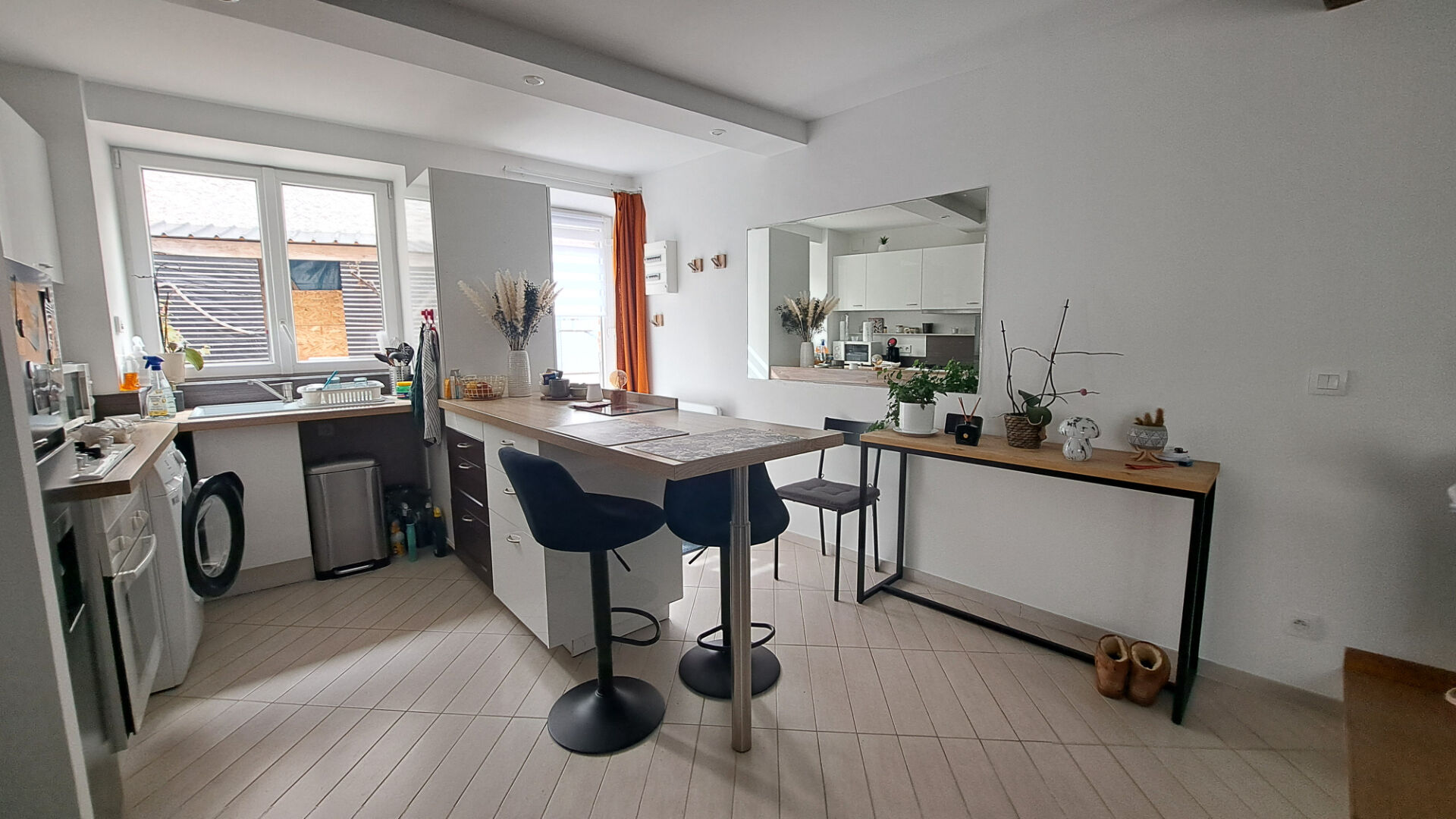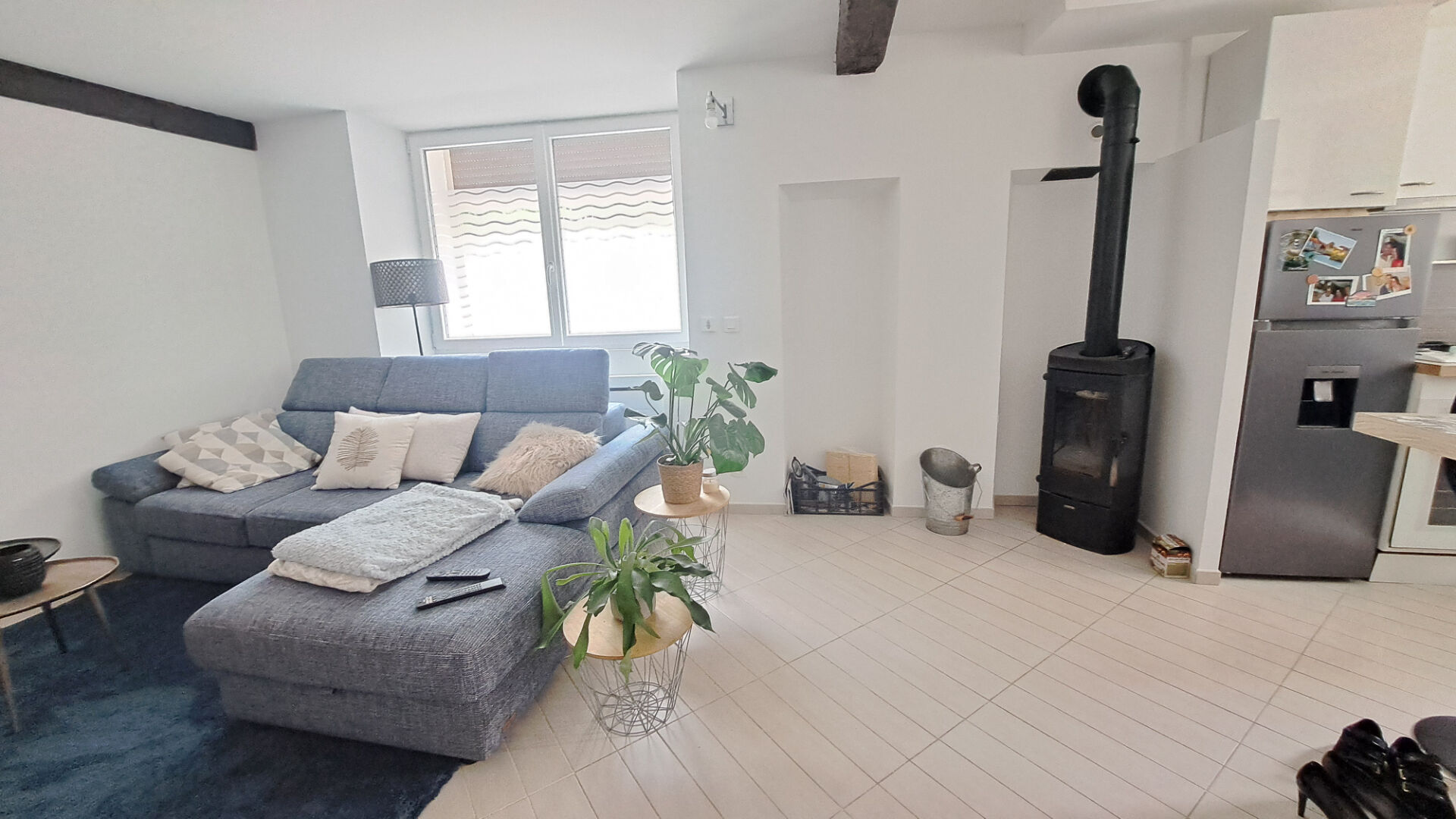 Au rez-de-chaussée, vous découvrirez une pièce de vie lumineuse avec cuisine ouverte sur le salon, agrémentée d'un poêle à bois qui apporte chaleur et convivialité.