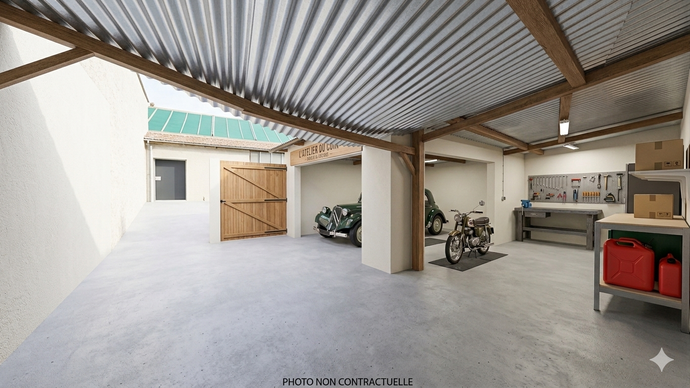 Elle dispose d'un petit bâtiment à usage de garage, actuellement constitué d'un appentis en tôle, reposant sur une structure en pieux bois et équipé d'une porte coulissante.