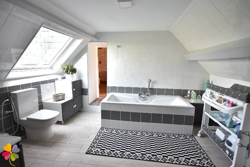 A suivre, une pièce traversante, accompagnée d?une salle d?eau et de toilettes séparées, mène à une spacieuse pièce de vie de 57 m² comprenant un espace séjour et un salon chaleureux avec cheminée.