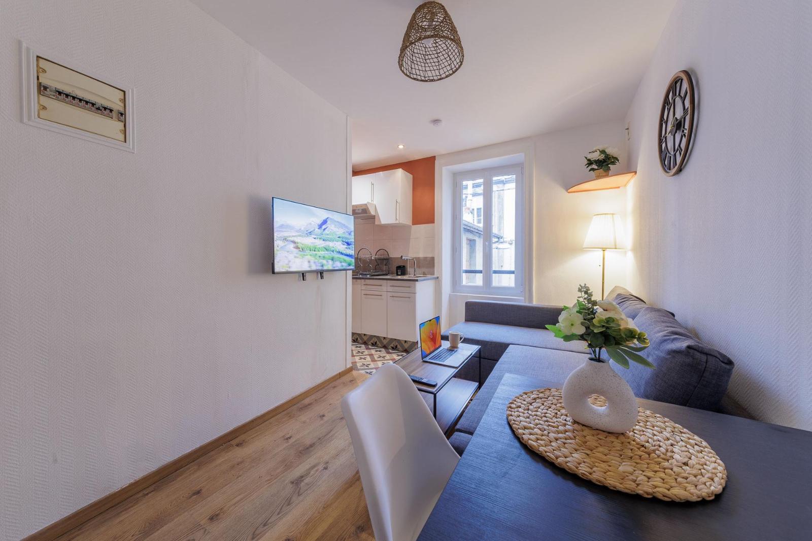 Rez-de-chaussée surélevé : appartement comprenant une pièce avec cuisine aménagée, une chambre, une salle de bains et WC