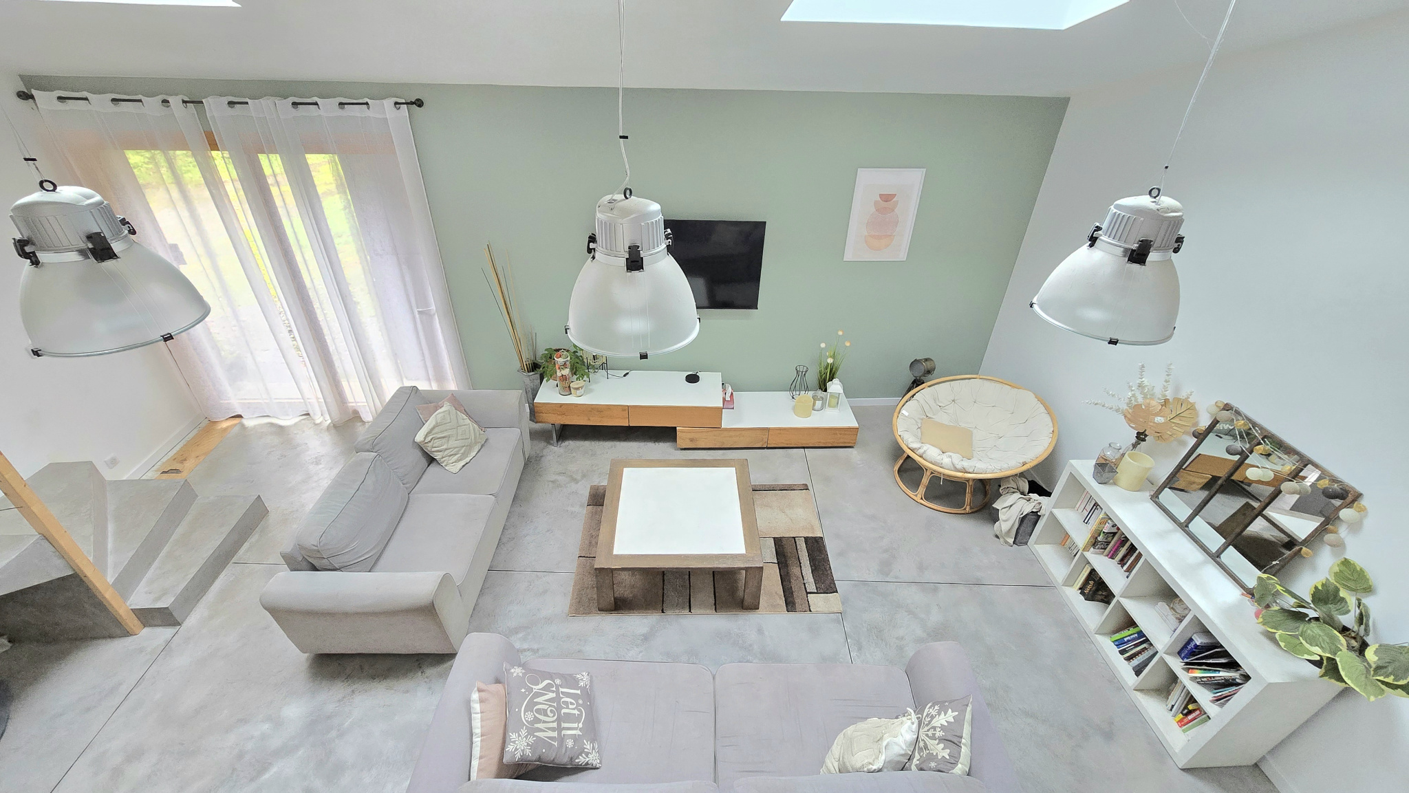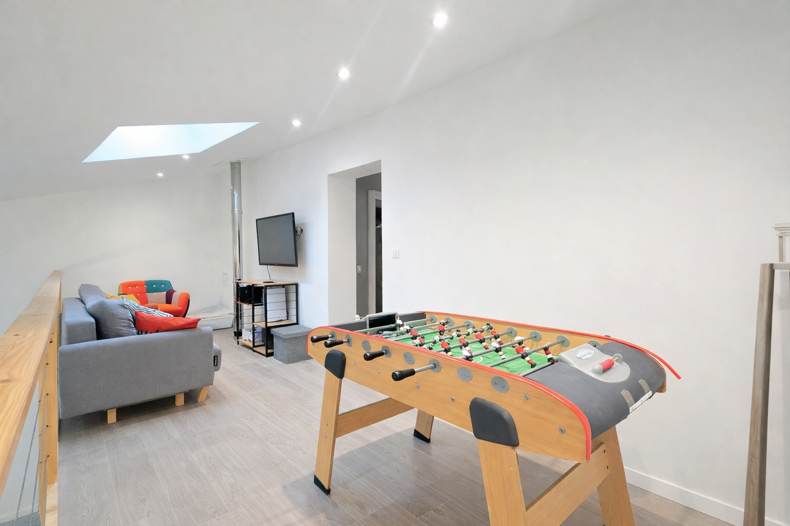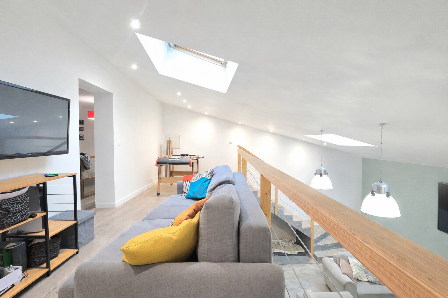 L'escalier situé côté salle à manger mène à l'espace nuit composé de trois chambres avec placards, dont une suite parentale avec salle d'eau privative. Une salle de bain indépendante ainsi qu'un WC complètent cet étage. Le palier communique avec une mezzanine surplombant la pièce de vie, parfaite pour un bureau, un espace détente ou une bibliothèque.