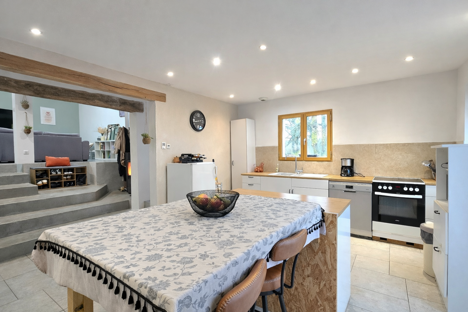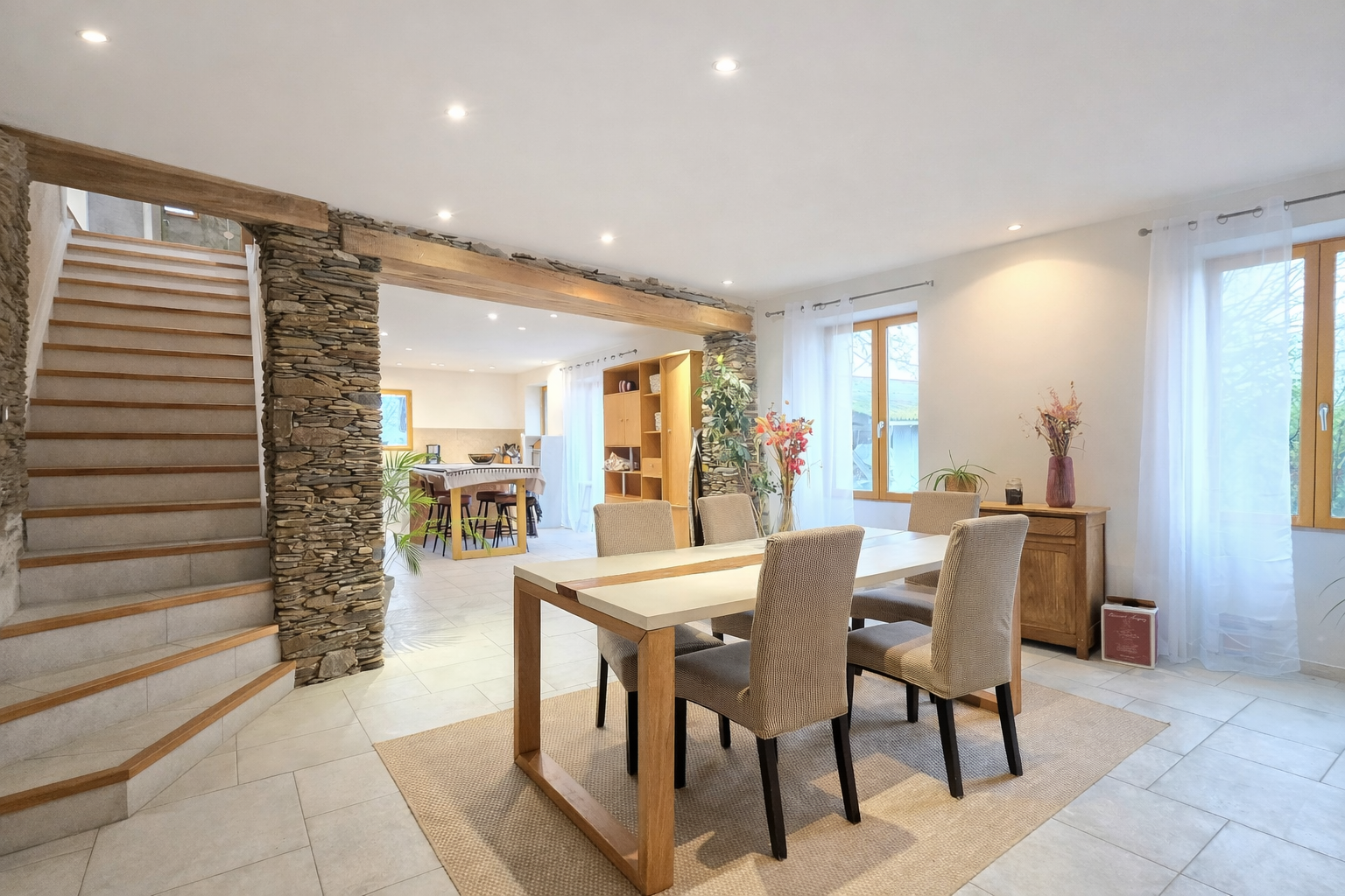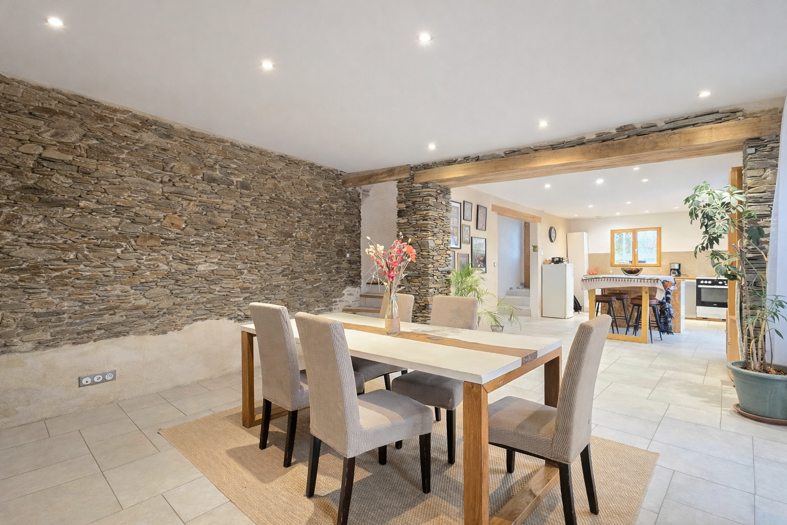 Dès l'entrée, le coup de coeur est immédiat grâce à une pièce de vie exceptionnelle de près de 90 m2, véritable signature de la maison avec ses murs en pierre. Elle se compose d'une cuisine ouverte sur un vaste espace salle à manger, puis se prolonge par un séjour aménagé dans une ancienne cave entièrement rénovée. L'ensemble est agrémenté d'un poêle à granulés, idéal pour des soirées conviviales. Les matériaux de qualité et le double escalier apportent une identité unique à cette pièce de vie aux volumes rares. Toujours au rez-de-chaussée, vous trouverez en espace bureau et un W.C