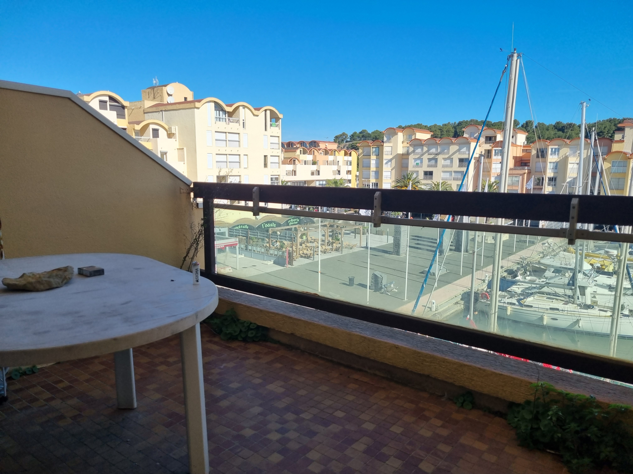 Une terrasse offrant une très belle vue dégagée sur le port.
