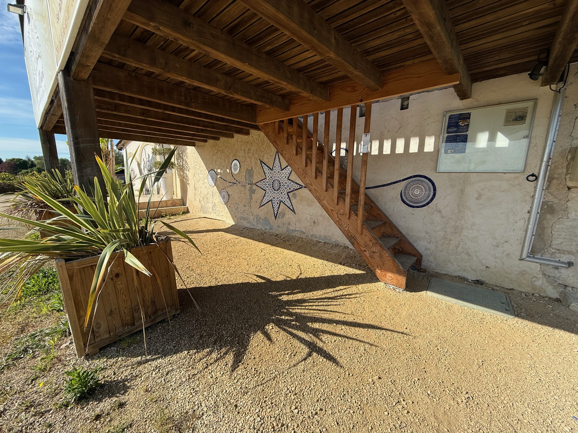 Belle terrasse en bois avec vue dégagée et préau couvert en dessous.