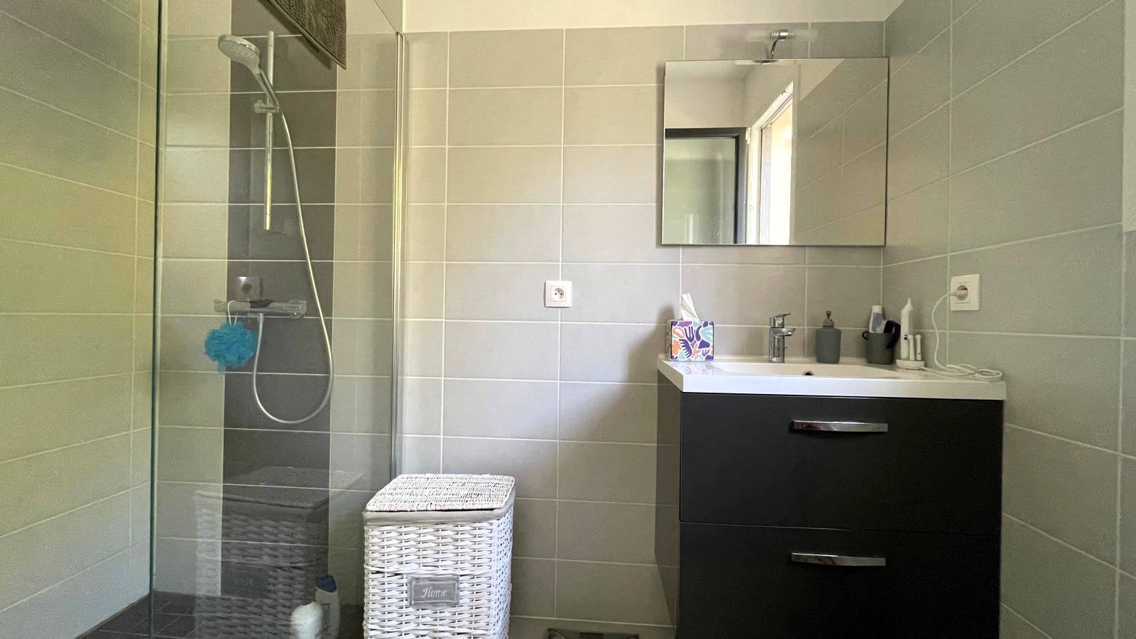 Le rez-de-chaussée offre une vie de plain-pied et comprend une entrée sur pièce de vie avec cuisine équipée ouverte et accès sur terrasse, une chambre, une salle d'eau et des WC.