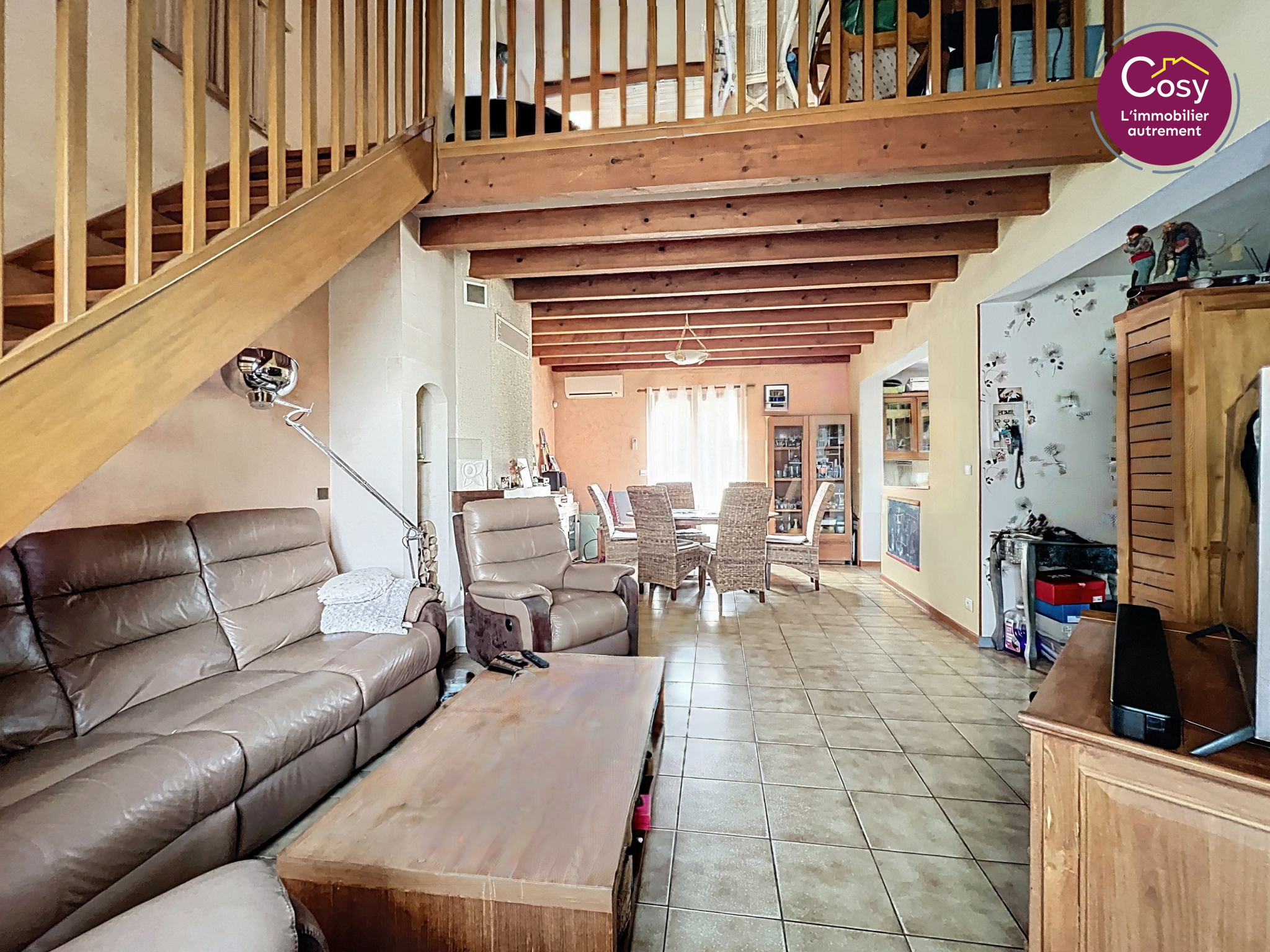 À l'étage, une mezzanine apporte un espace supplémentaire modulable selon les envies, et une chambre spacieuse avec grand dressing complète cet ensemble chaleureux et fonctionnel.