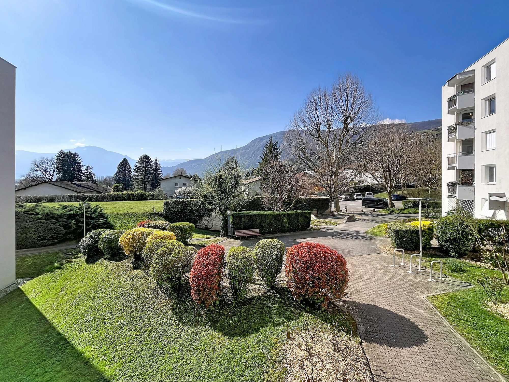 Dès l'entrée, vous apprécierez un espace fonctionnel avec placard intégré. La pièce de vie lumineuse de 20,68 m2 offre une agréable vue dégagée sur un jardin verdoyant ainsi que sur les magnifiques montagnes de la Chartreuse, apportant calme et sérénité au quotidien.