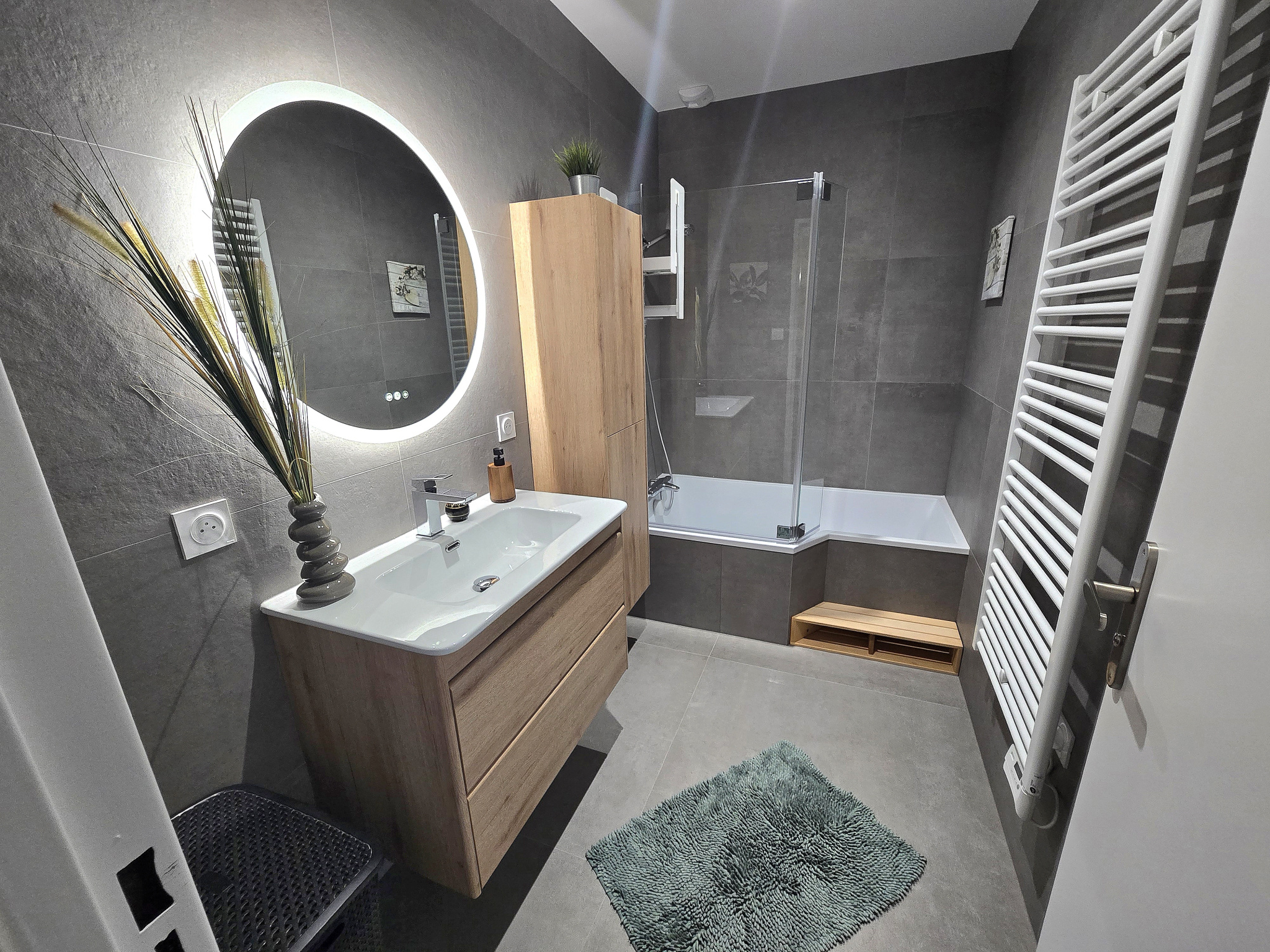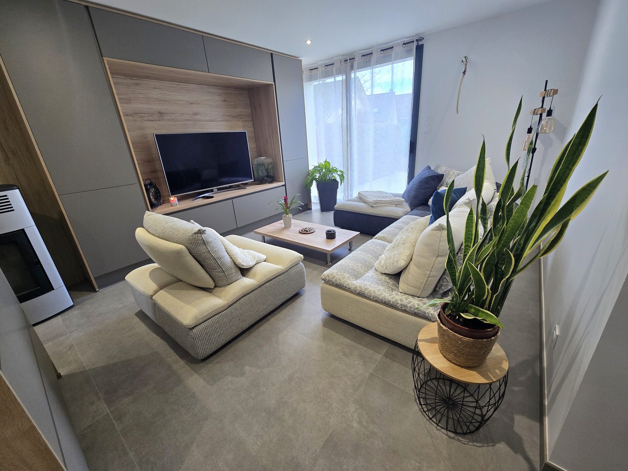 Celle-ci comprend : Entrée de 2 m2 avec placard, cuine équipée neuve ouverte sur salon/séjour de 37,19m2 avec accès terrasse, salle d'eau avec douche italienne et wc de 7m2. Garage attenant de 12,14m2.