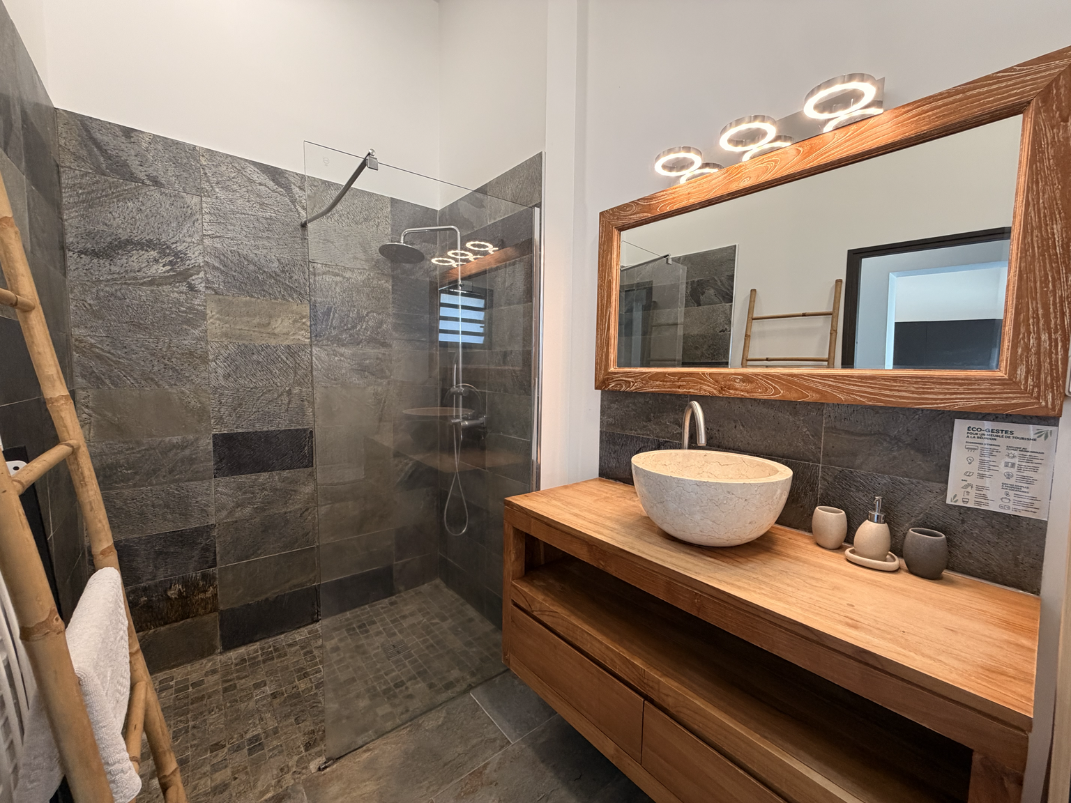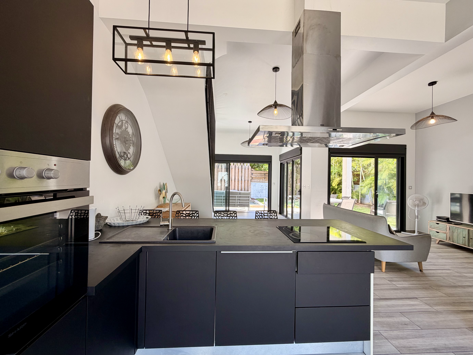 - au rez-de-chaussée : d'une entrée, cuisine américaine entièrement équipée ouverte sur un lumineux séjour donnant sur ma terrasse/piscine. Une salle d'eau avec douche l'italienne et meuble double vasque.