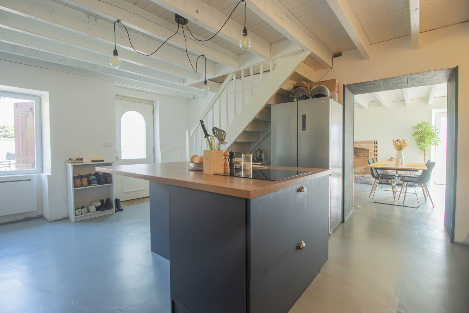 Elle offre un espace de vie agréable et lumineux, une cuisine aménagée et équipée avec son mur de pierres parfaitement mis en valeur, une salle d'eau fonctionnele et spacieuse, ainsi que deux chambres confortables.