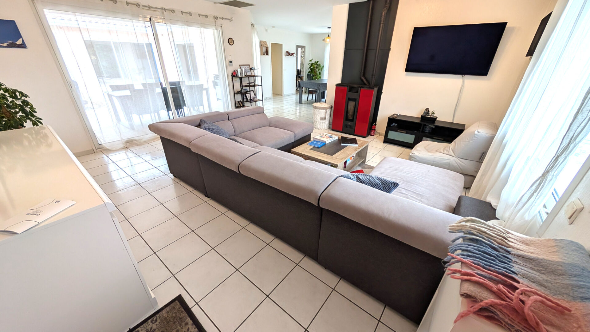Et l'intérieur, me direz-vous ? Une fois la porte d'entrée franchie, on se trouve dans un vaste salon-séjour très lumineux qui offre une disposition en deux espaces de vie distincts néanmoins ! Idéal pour créer plusieurs ambiances. Plusieurs baies ouvrent sur la terrasse pour donner une agréable sensation d'ouverture une fois ouvertes. Et pour l'hiver, le poêle à pellets apportera la chaleur et la douceur de la flamme. La cuisine est équipée, lumineuse et indépendante. De quoi satisfaire toutes les velléités culinaires ! Elle donne un accès direct sur un cellier-buanderie, lui-même directement accessible depuis le garage ! En ce qui concerne les zones nuit, là encore le plan est très intelligemment pensé.