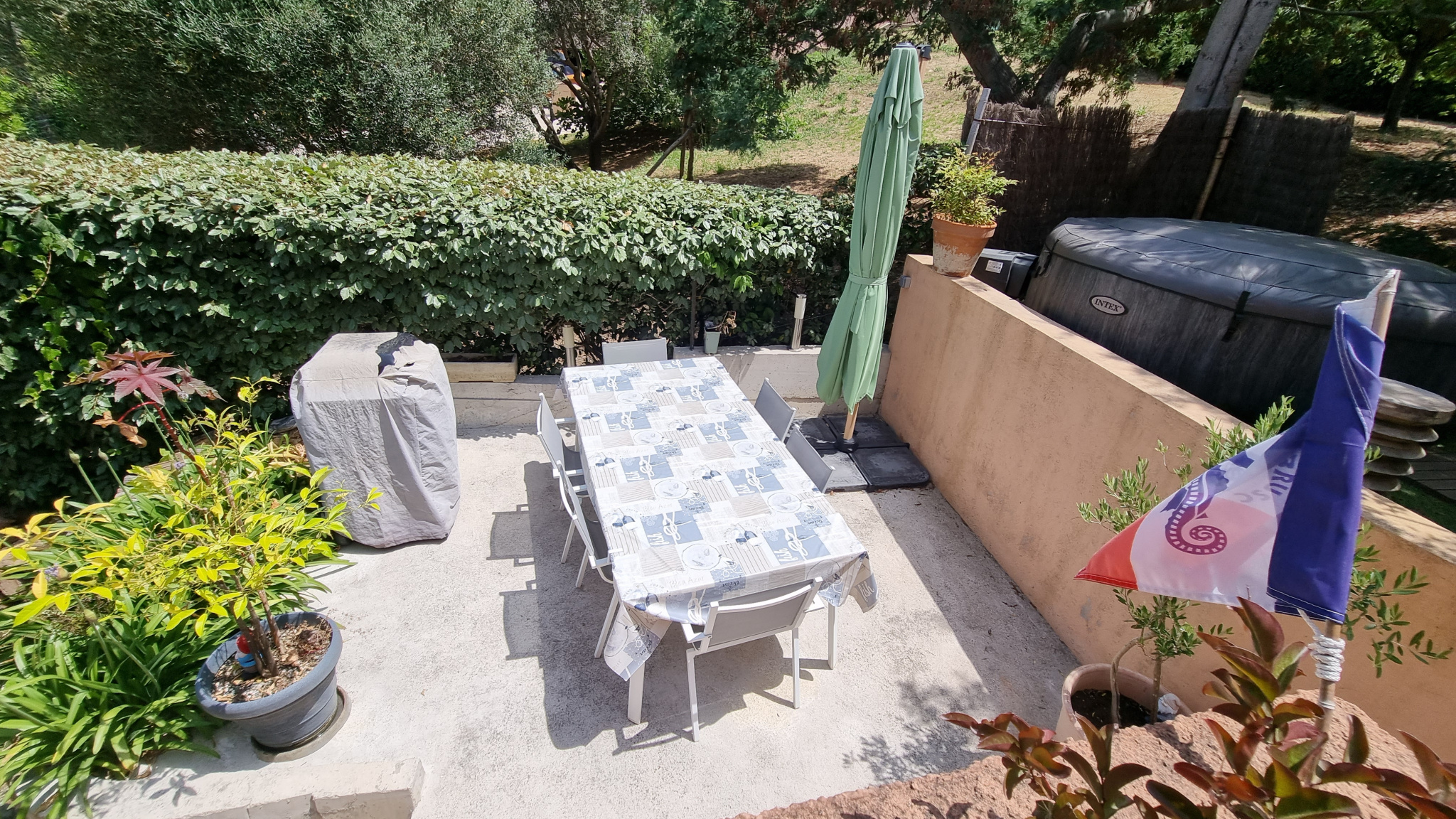 un jardin articulé en restanque vient compléter cette offre avec terrasse, un garage type Box, un débarras attenant et une place de parking privé aérienne.