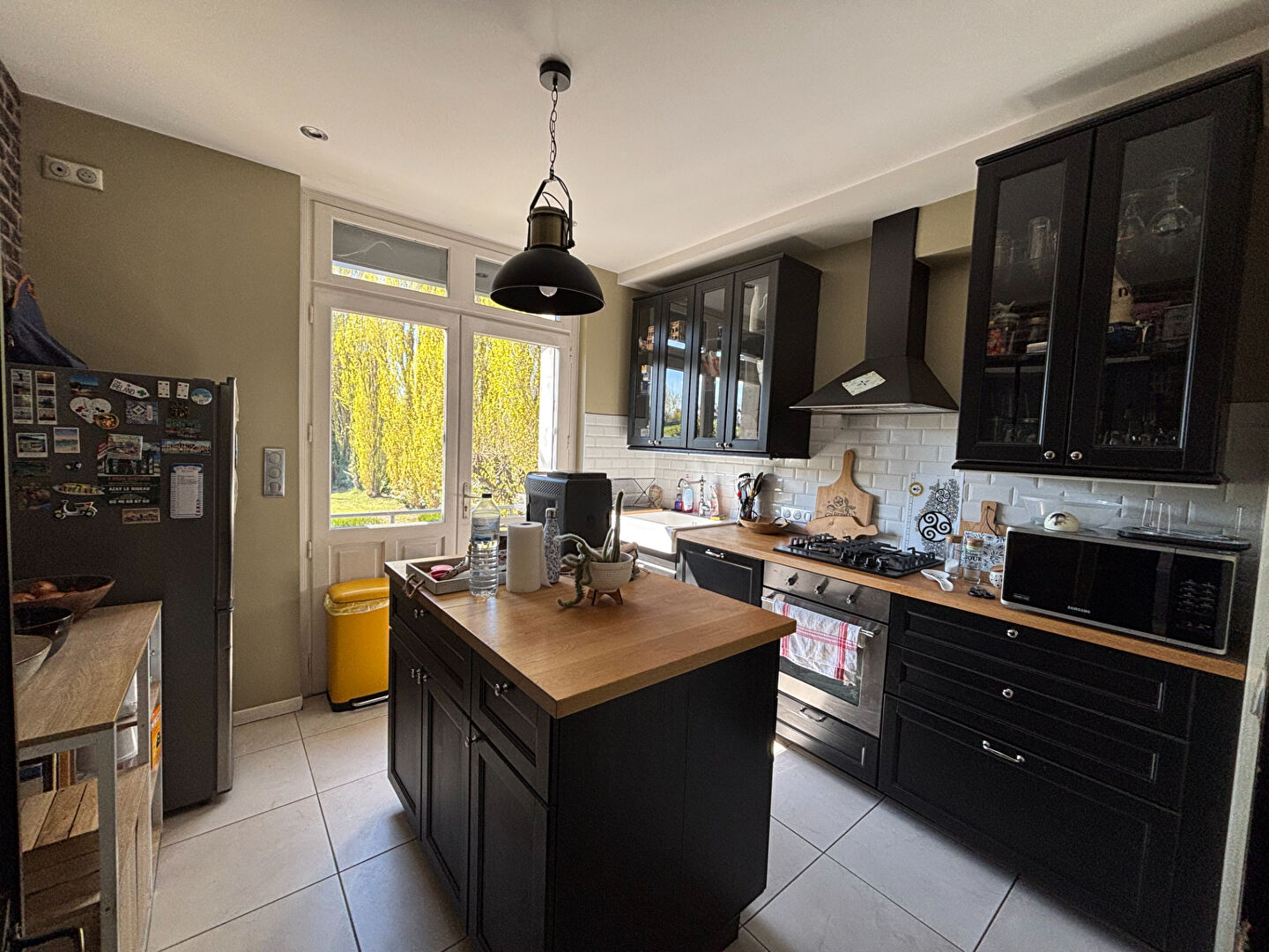 Une cuisine indépendante aménagée et équipée avec vue sur la pièce de vie grâce à sa verrière et un wc séparé.