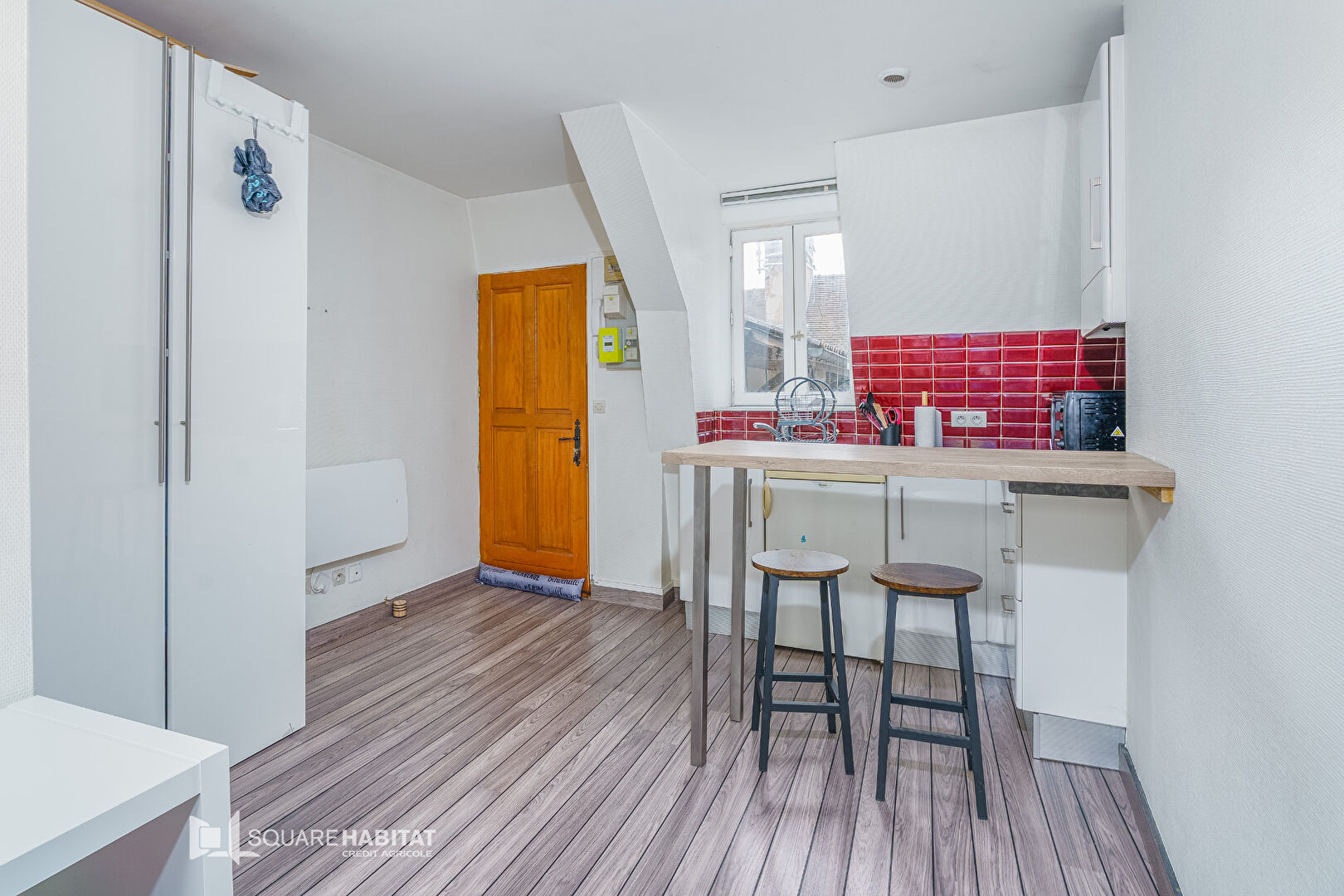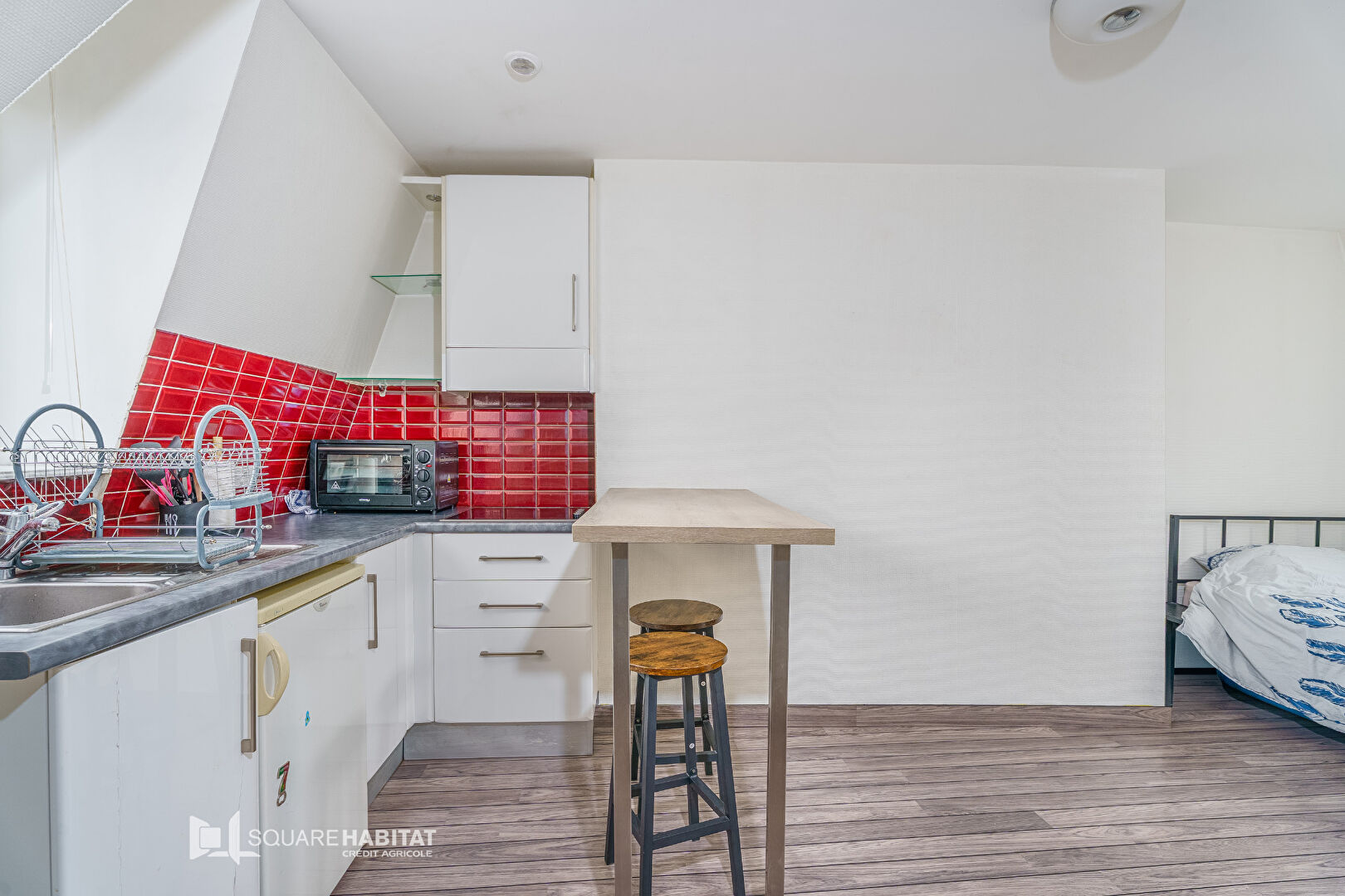 Le bien offre une pièce de vie lumineuse avec son coin cuisine aménagée et équipée ainsi qu'une salle d'eau avec w.c.