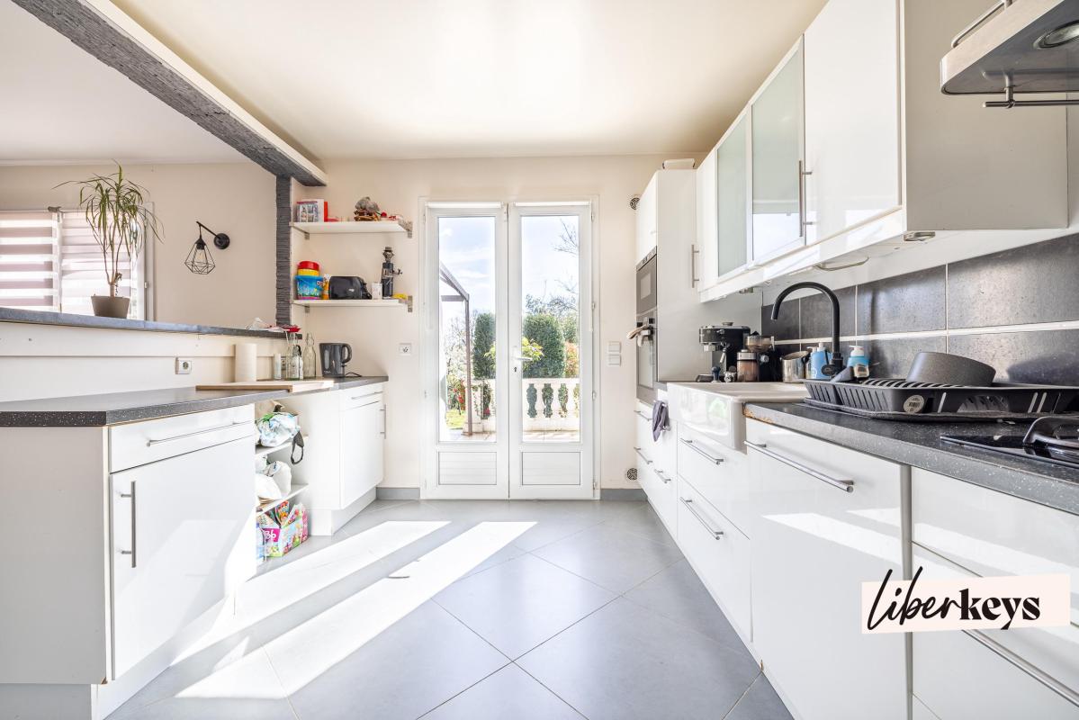 L'intérieur de la maison a été conçu pour favoriser la convivialité et la lumière. Le coeur du foyer s'articule autour d'un vaste salon-séjour avec une cuisine américaine moderne, créant un espace de vie ouvert et chaleureux où la famille se retrouve naturellement. La circulation est fluide et l'ouverture vers l'extérieur est omniprésente : le salon et la cuisine s'ouvrent tous deux sur une superbe terrasse. Véritable extension de la maison, elle constitue le cadre parfait pour vos déjeuners au soleil ou vos soirées contemplatives face à la nature.