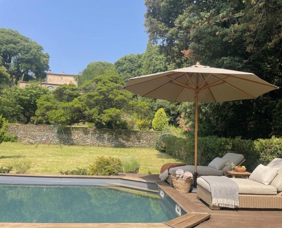 En contrebas, une piscine de 8 x 4,5 m, équipée d'un filtre au verre et d'un système Bio-UV, profite d'une grande terrasse ensoleillée.