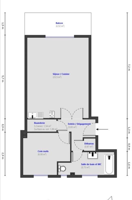 Initialement conçu comme un studio, ce bien a été entièrement réaménagé pour offrir tout le confort d'un 2 pièces fonctionnel. L'espace intérieur s'articule autour d'une entrée avec dégagement desservant un coin nuit indépendant, une salle de bains avec WC, ainsi qu'un débarras et une buanderie pour un rangement optimal.