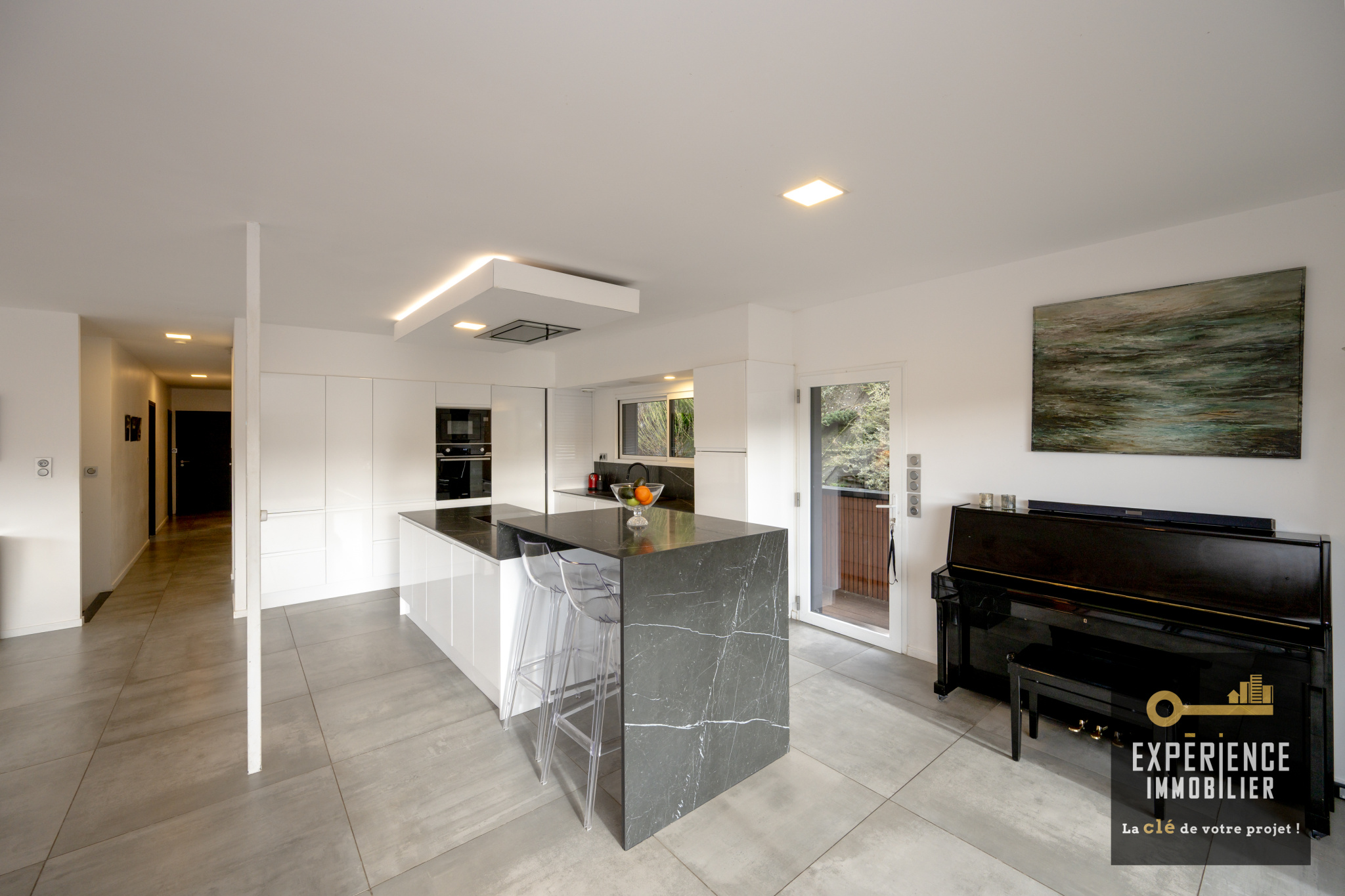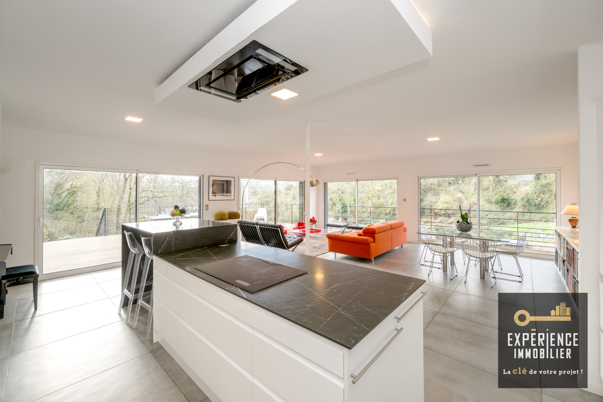 À l'étage, le vaste espace de vie -- salon, séjour et cuisine américaine -- s'ouvre sur l'extérieur, laissant entrer une lumière naturelle abondante et offrant une vue panoramique exceptionnelle.