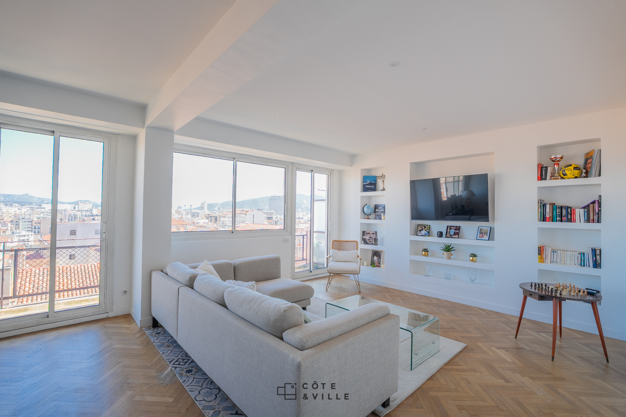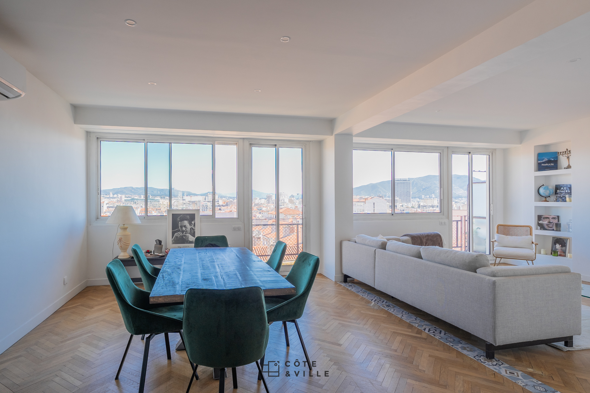 Le vaste espace de vie, baigné de lumière, offre de superbes volumes avec un salon et une salle à manger harmonieusement agencés, prolongés par un balcon avec vue totalement dégagée sur les toits de Marseille.