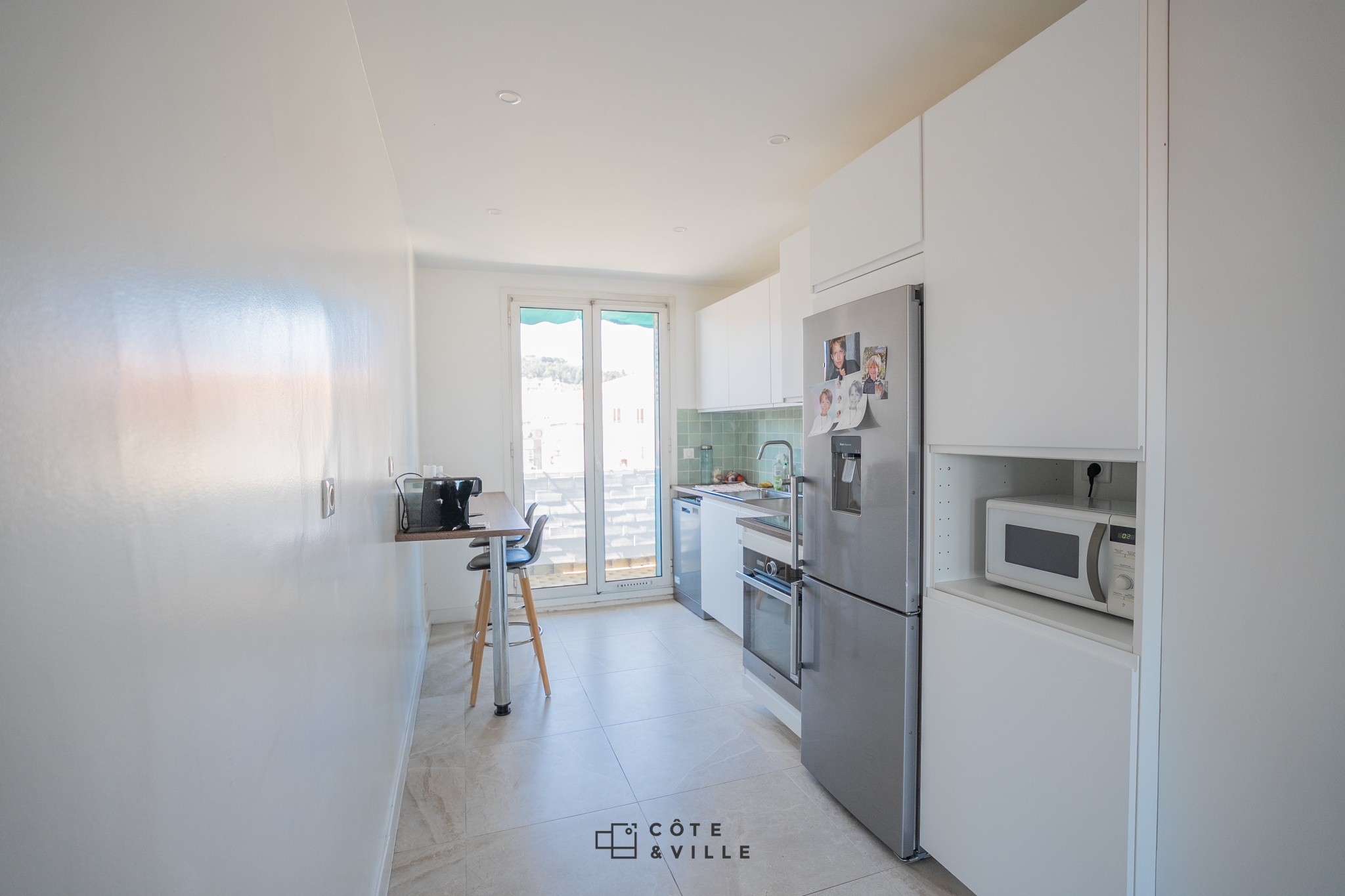 De l'autre côté, une cuisine indépendante entièrement équipée s'ouvre sur une agréable terrasse offrant une vue imprenable sur Notre-Dame de la Garde.