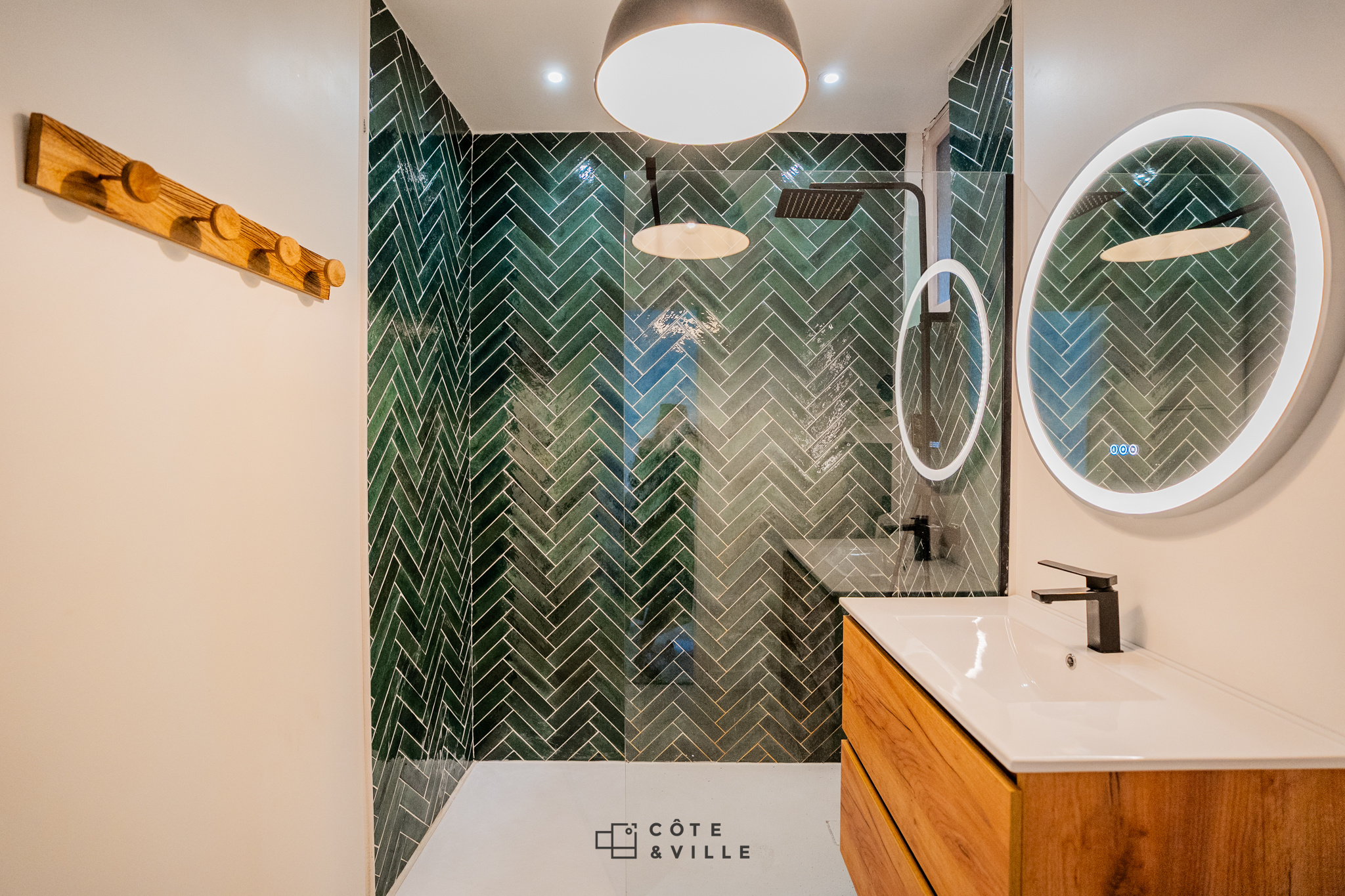 Côté nuit, vous trouverez deux grandes chambres avec rangements, ainsi qu'une salle d'eau contemporaine au design soigné.