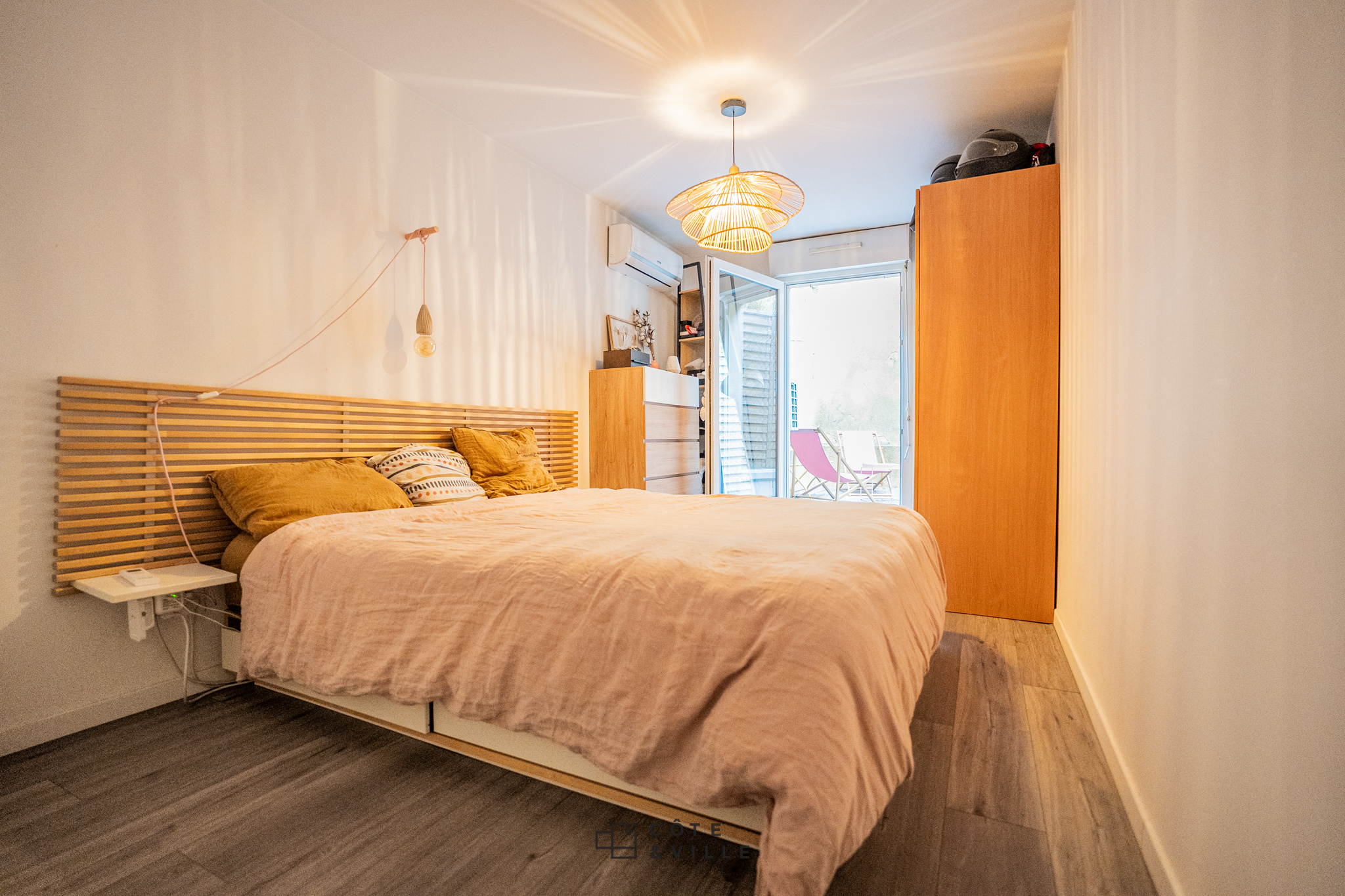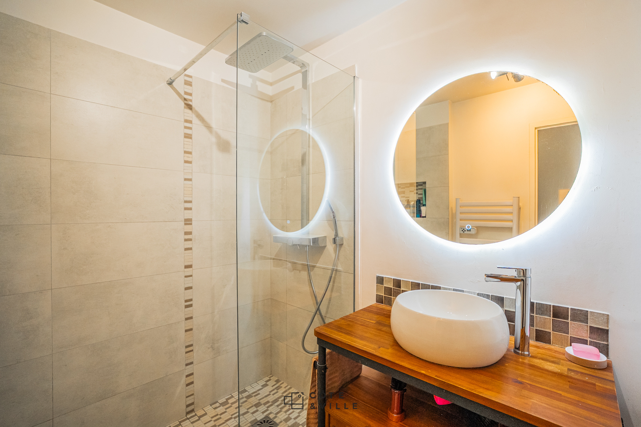 Côté nuit, l'appartement propose une grande chambre avec rangements, ainsi qu'une élégante salle d'eau aux prestations soignées.