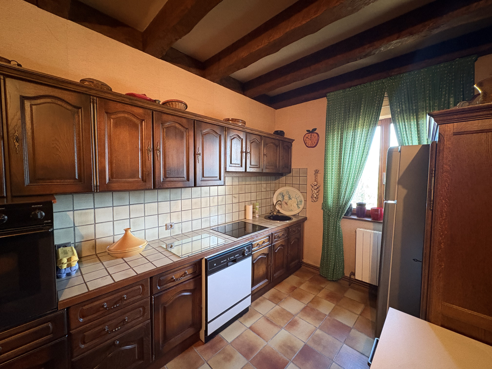 au rez-de-chaussée : entrée avec rangement, cuisine aménagée rustique, sapcieux salon-séjour, une chambre, salle d'eau + WC.