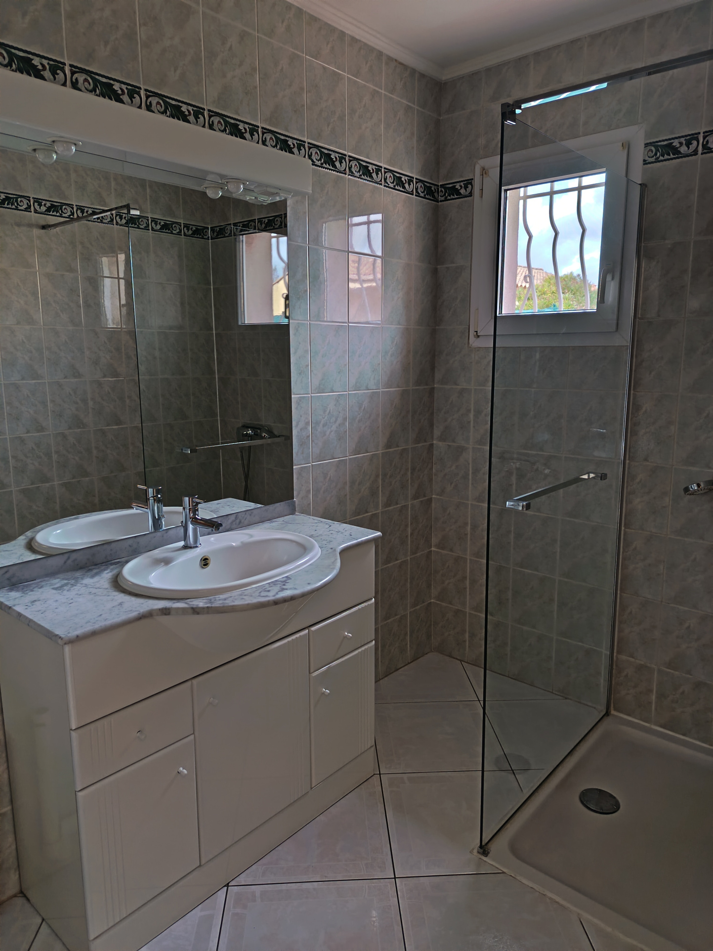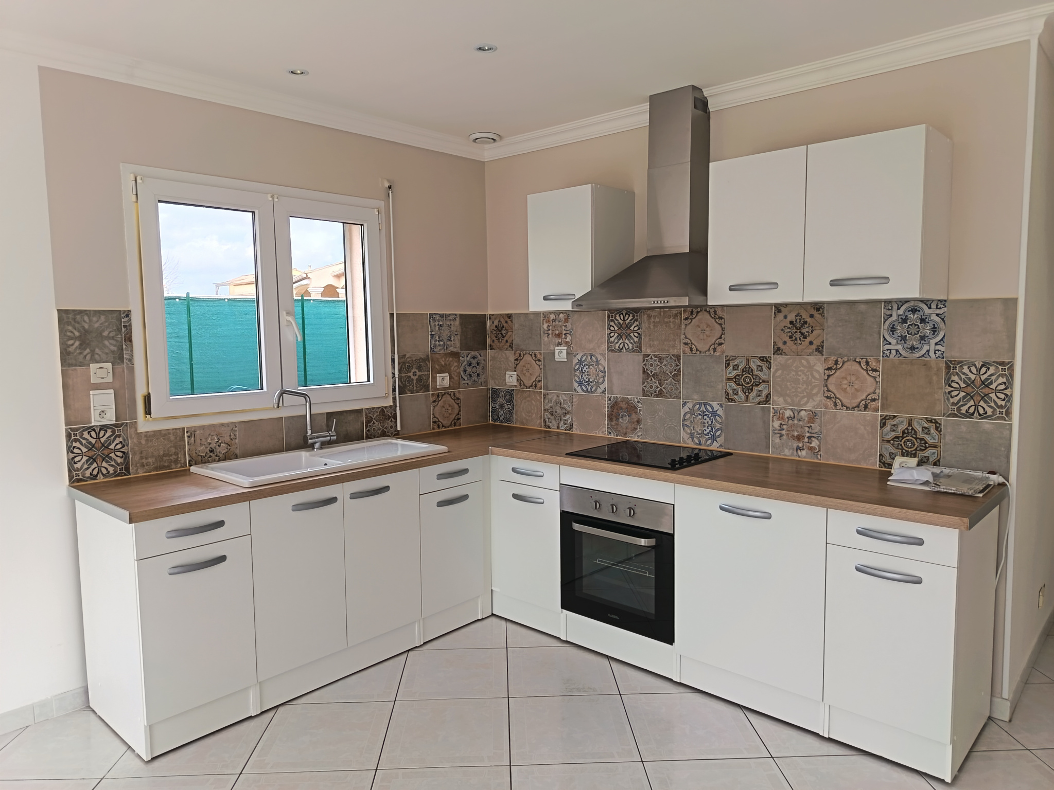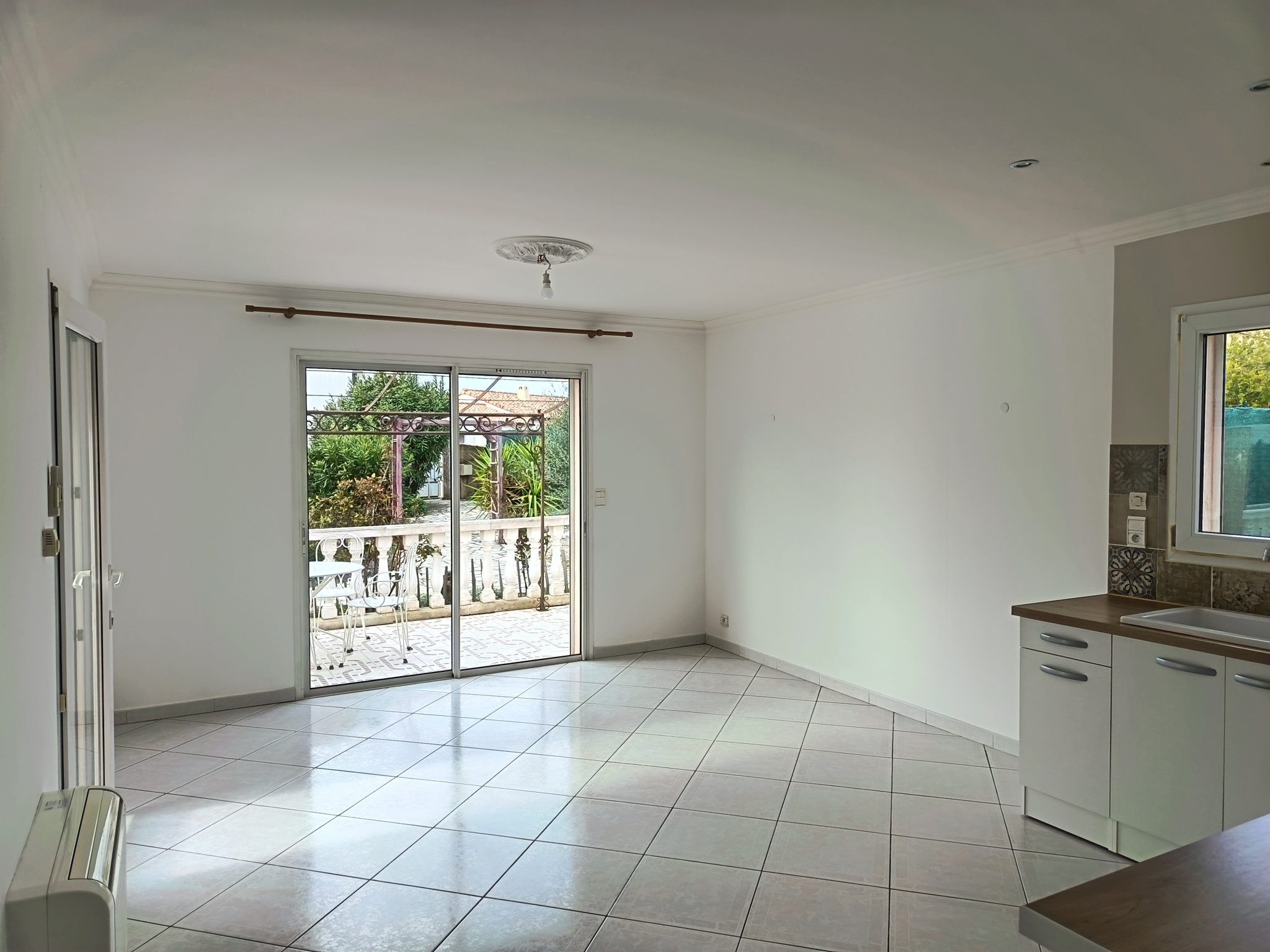 Sa composition est simple , la maison est mitoyenne de deux cotés offrant une cuisine neuve aménagée et équipée ouverte sur un séjour lumineux donnant sur une terrasse . Climatisation réversible .